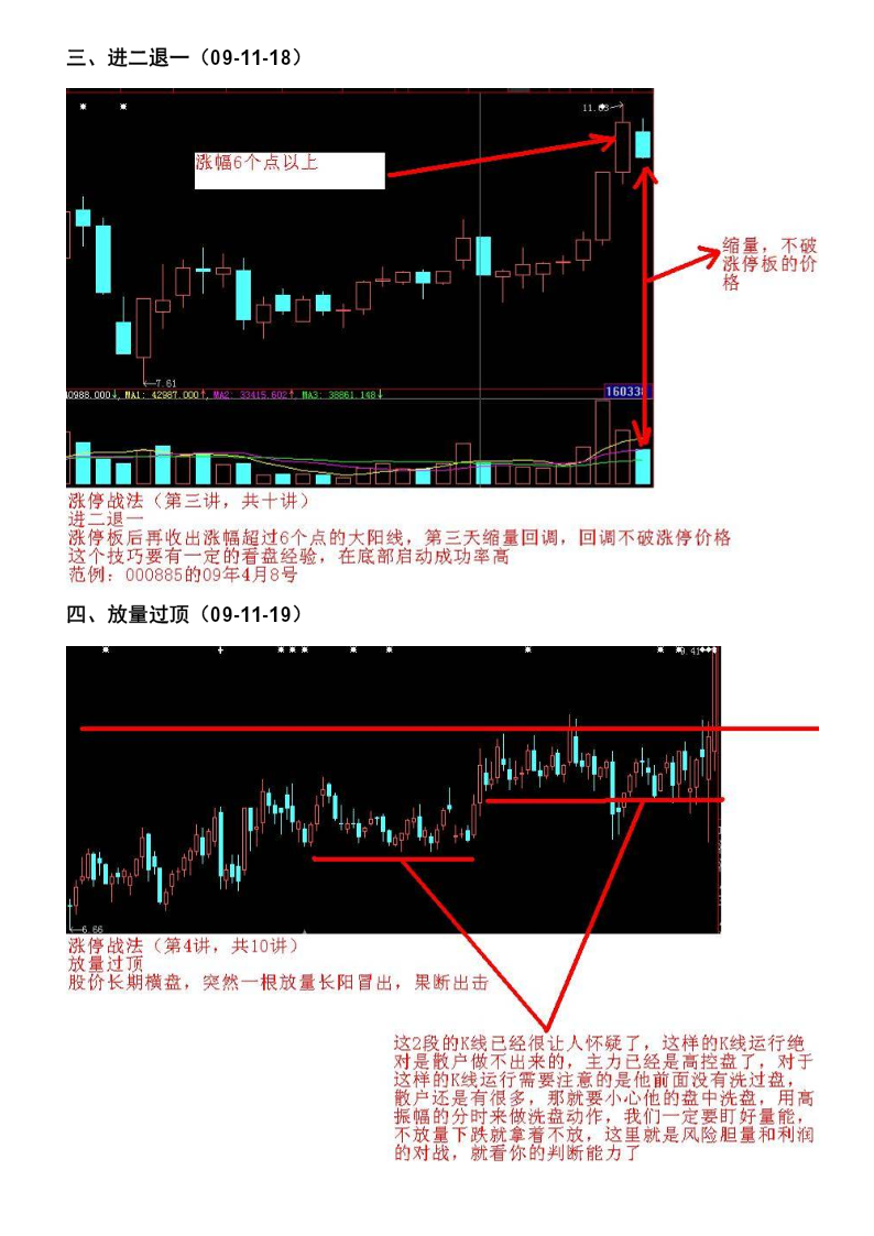 K线为王、涨停战法涨停战法送给永远冲在最前面的敢死队成员:优点:利润大;缺点:风险大;提醒:大盘不稳准对不要使用,这个是短线客的法宝,没有把握绝不使用。K线为王送给天下所有股民:优点:一般会骑马到底;缺点:要有耐心发现,紧盯;提醒:大盘不好是大机会的开始,要有耐心等待机会。开贴目的:边赚钱边学习,股票买了要涨,并且要搞懂为什么会涨,以后要自己找出会涨的,这样才会永不败。第一篇、涨停战法一、攻击迫线(09-11-17)以上攻击迫线范例参照:000908的09年7月23号和600300的09年7月10号。二、