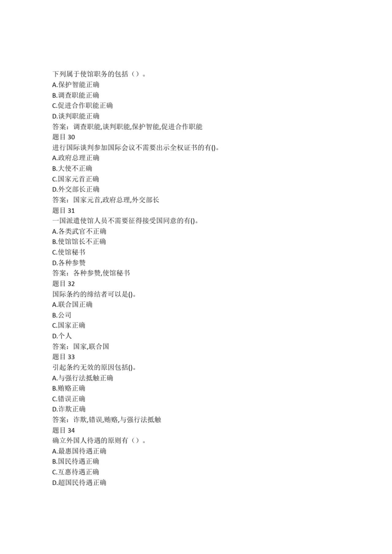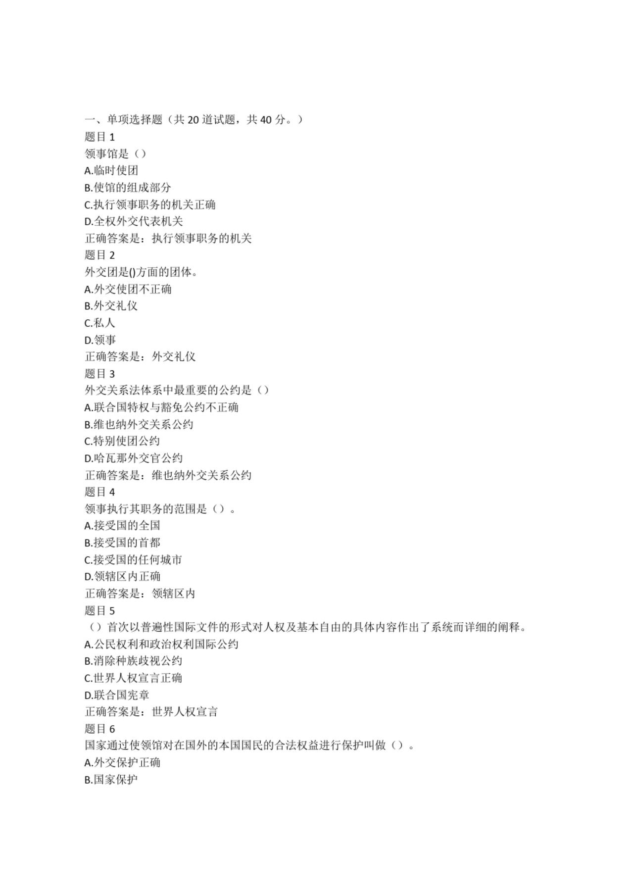 电大《国际公法》形成性考核册作业答案一一、不定向选择题1、C2、D3、ABCD4、BD5、ABC6、B7、ACD8、AB二、填空题1、威斯特伐里亚公会的召开和-《威斯特伐里亚和约》的签订;格老秀斯《战争与和平法》的发表2、司法判例、权威公法学家学说、国际组织的决议3、国家、国际组织、争取独立的民族解放组织4、18世纪末19世纪国际法委员会三、问答题1、国际法有哪些特征?它的效力依据是什么?答:1、国际法的特征:(1)国际法的主体主要是国家调整的对象主要是国家间的