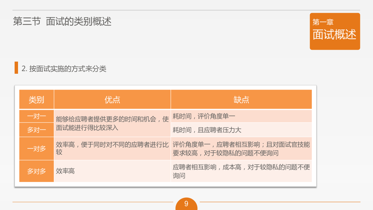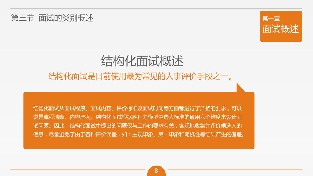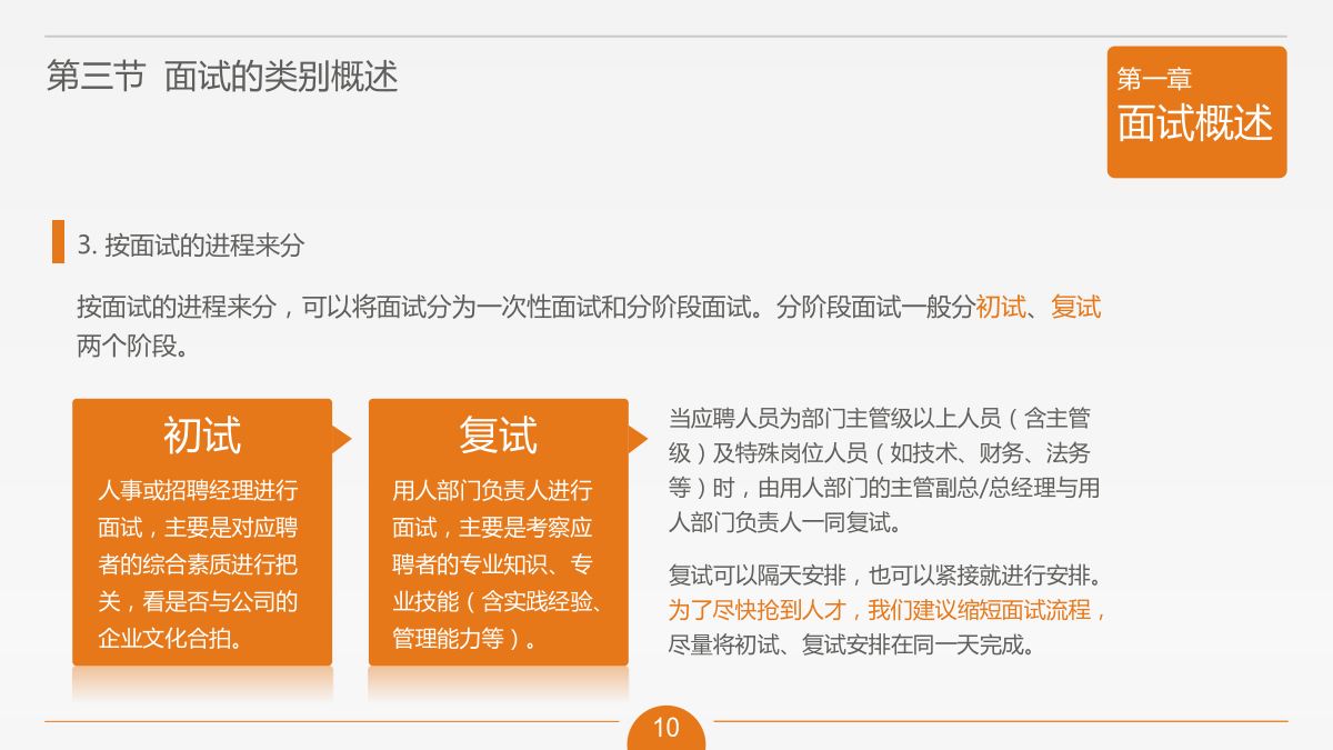 面试概述第一章面试概述第一节面试的定义及目的第二节面试的过去与未来第二节面试的过去与未来选拔面试是最常用的甄选工具之一并行之有效。是否能发挥优势关键在于面试官本身的素质和能力。因此面试不能仅凭感觉。面试官必须参加面试技能的培训比如如何通过特定的问题挖掘自己想了解的信息如何观察候选人如何判断候选人所反馈信息的真伪等等。在掌握了面试的技能之后才有资格参与面试工作就像上岗需要合格证一样。第二章面试的误区及原则自古以来识人是一件很难的事儿。诸葛亮还要“挥泪斩马谡”呢何况你我凡人更何况仅仅通