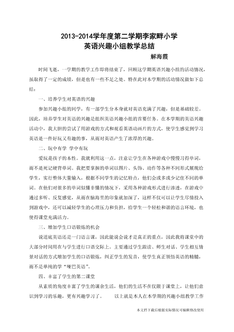 2013-2014学年度第二学期李家畔小学英语兴趣小组教学总结解海霞时间飞逝,一学期的教学工作即将结束了,回顾这学期英语兴趣小组的活动情况,虽取得了一定的成绩,但是也有一些不足之处。特在此对本学期的活动情况做如下总结:一、培养学生对英语的兴趣参加兴趣小组的同学,有一部学生分本身就对英语充满了兴趣,但是基础较差。因此,培养学生对英语的兴趣是组织英语兴趣小组的首要任务。在本学期的英语兴趣活动中,我大胆的尝试了用游戏的方式和观看英语动画片的方式,使学生感觉到学习英语是一件好玩又有趣的事,从而对英语产生了浓厚的兴