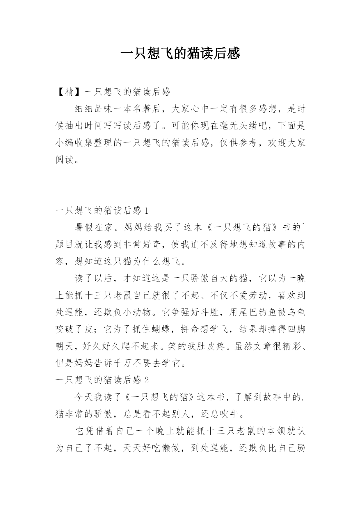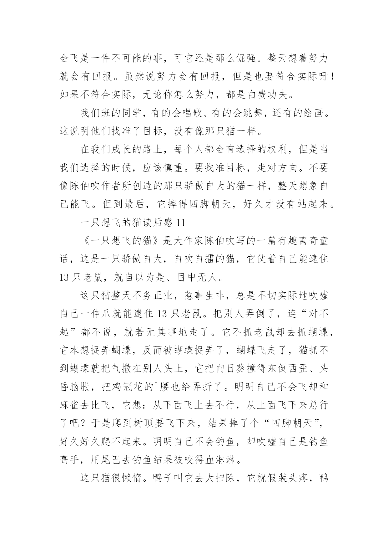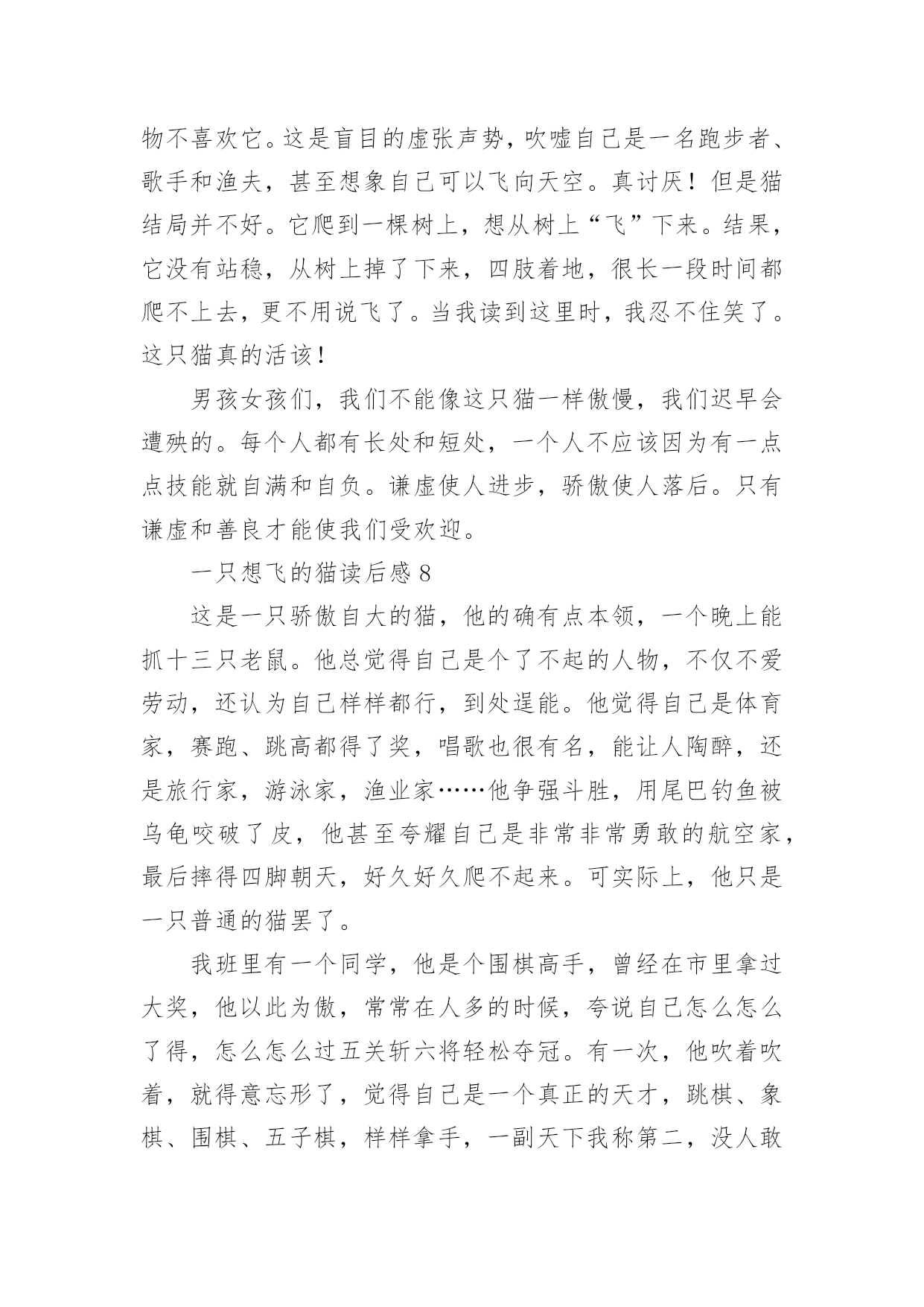 一只想飞的猫读后感【精】一只想飞的猫读后感细细品味一本名著后,大家心中一定有很多感想,是时候抽出时间写写读后感了。可能你现在毫无头绪吧,下面是小编收集整理的一只想飞的猫读后感,仅供参考,欢迎大家阅读。一只想飞的猫读后感1暑假在家。妈妈给我买了这本《一只想飞的猫》书的`题目就让我感到非常好奇,使我迫不及待地想知道故事的内容,想知道这只猫为什么想飞。读了以后,才知道这是一只骄傲自大的猫,它以为一晚上能抓十三只老鼠自己就很了不起、不仅不爱劳动,喜欢到处逞能,还欺负小动物。它争强好斗胜,用尾巴钓鱼被乌龟咬破了皮;