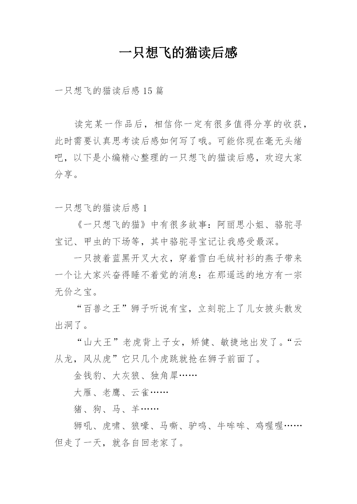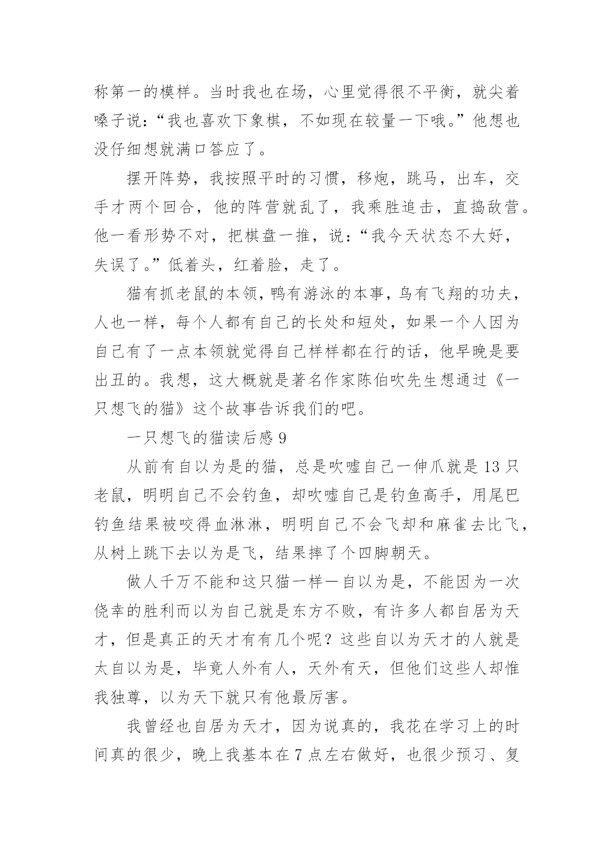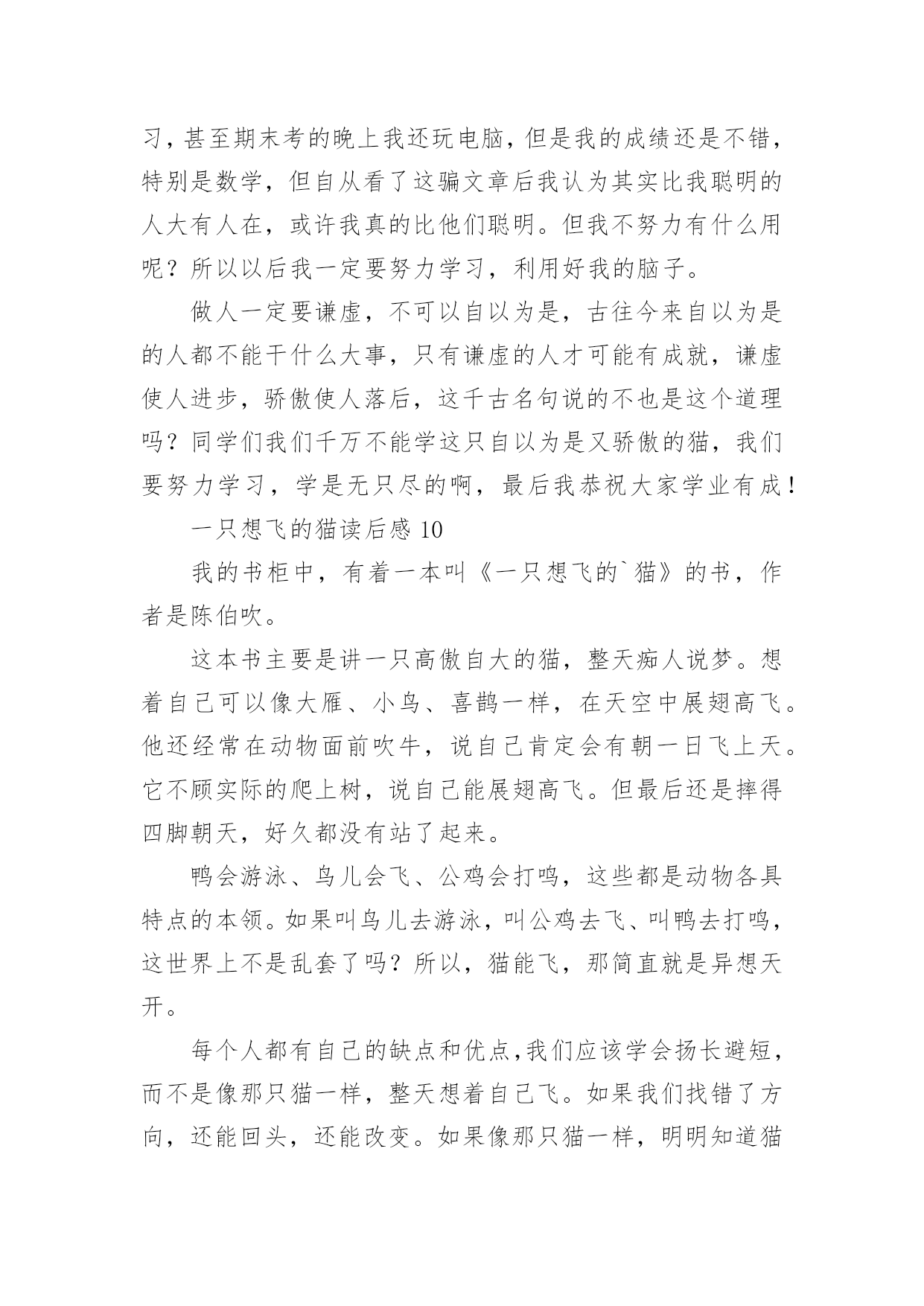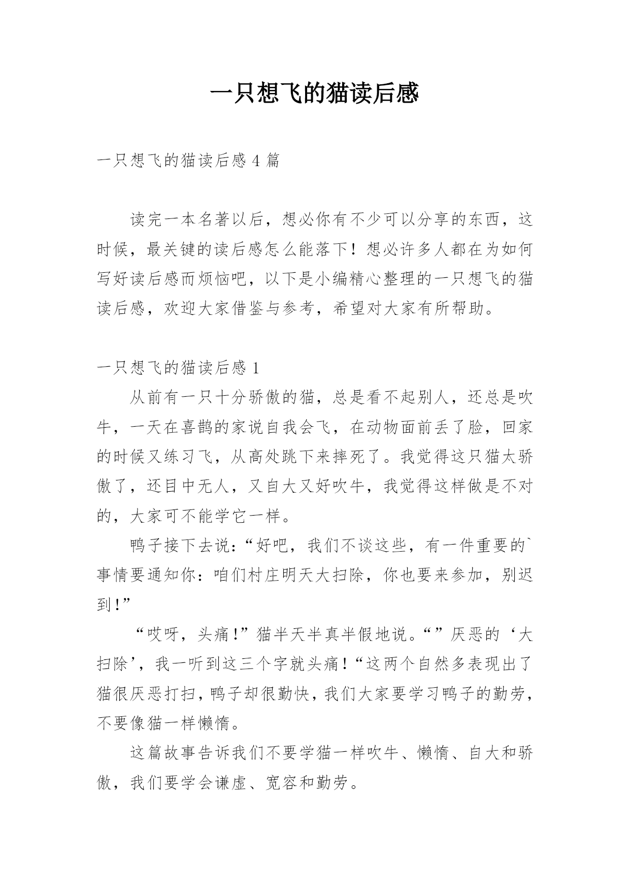 一只想飞的猫读后感【精】一只想飞的猫读后感细细品味一本名著后,大家心中一定有很多感想,是时候抽出时间写写读后感了。可能你现在毫无头绪吧,下面是小编收集整理的一只想飞的猫读后感,仅供参考,欢迎大家阅读。一只想飞的猫读后感1暑假在家。妈妈给我买了这本《一只想飞的猫》书的`题目就让我感到非常好奇,使我迫不及待地想知道故事的内容,想知道这只猫为什么想飞。读了以后,才知道这是一只骄傲自大的猫,它以为一晚上能抓十三只老鼠自己就很了不起、不仅不爱劳动,喜欢到处逞能,还欺负小动物。它争强好斗胜,用尾巴钓鱼被乌龟咬破了皮;