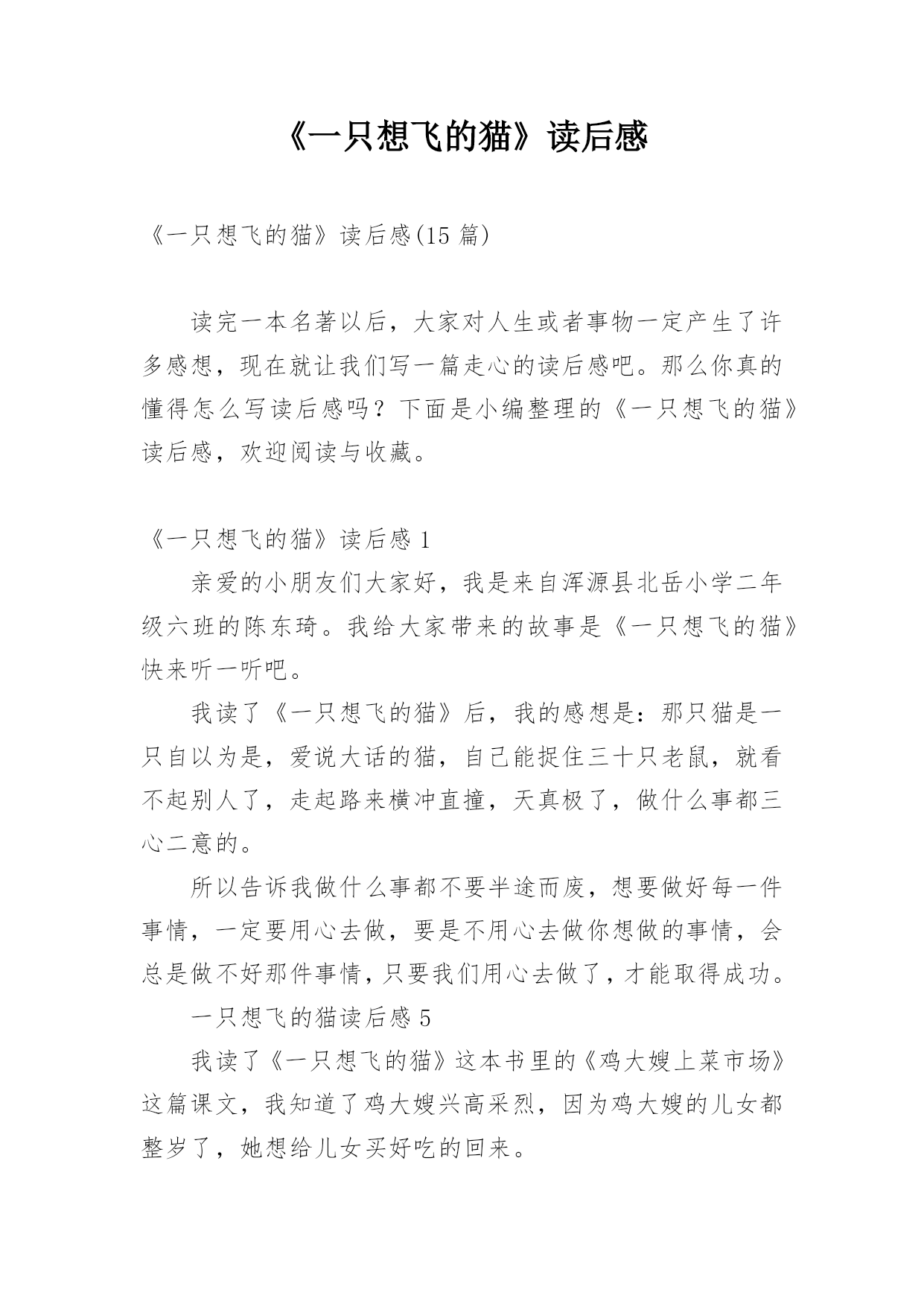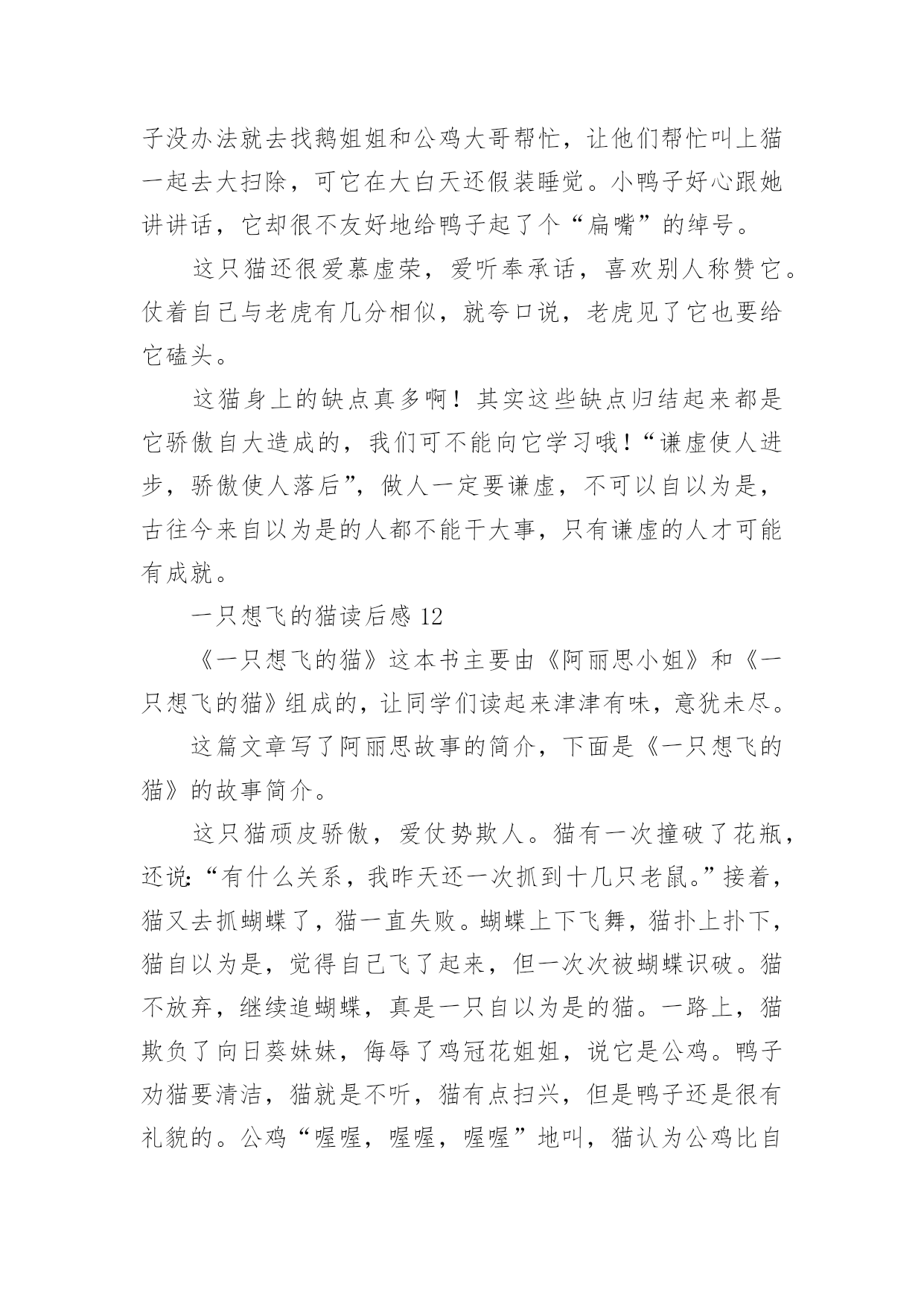 《一只想飞的猫》读后感《一只想飞的猫》读后感(15篇)读完一本名著以后,大家对人生或者事物一定产生了许多感想,现在就让我们写一篇走心的读后感吧。那么你真的懂得怎么写读后感吗?下面是小编整理的《一只想飞的猫》读后感,欢迎阅读与收藏。《一只想飞的猫》读后感1亲爱的小朋友们大家好,我是来自浑源县北岳小学二年级六班的陈东琦。我给大家带来的故事是《一只想飞的猫》快来听一听吧。我读了《一只想飞的猫》后,我的感想是:那只猫是一只自以为是,爱说大话的猫,自己能捉住三十只老鼠,就看不起别人了,走起路来横冲直撞,天真极了,做