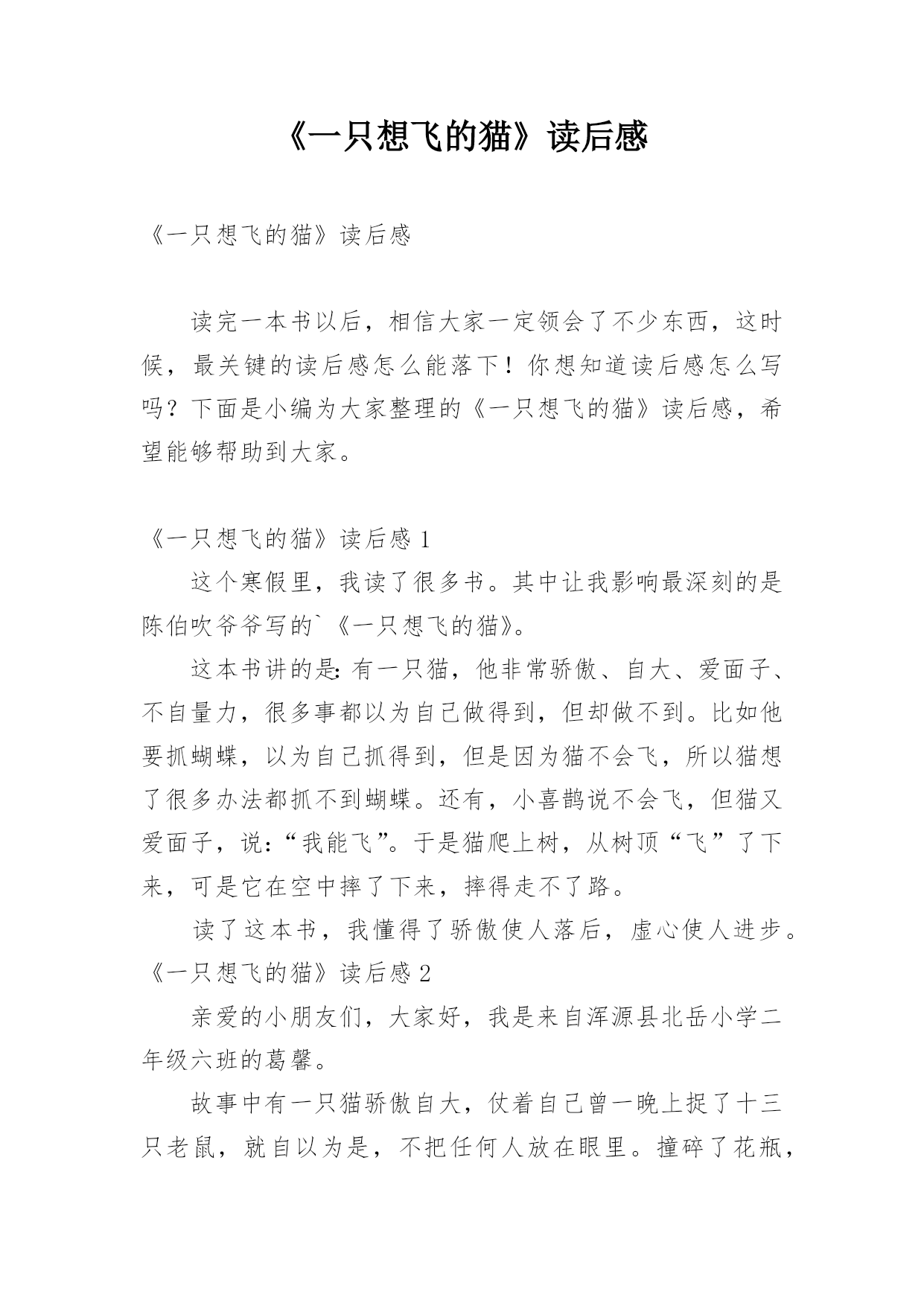 《一只想飞的猫》读后感《一只想飞的猫》读后感读完一本书以后,相信大家一定领会了不少东西,这时候,最关键的读后感怎么能落下!你想知道读后感怎么写吗?下面是小编为大家整理的《一只想飞的猫》读后感,希望能够帮助到大家。《一只想飞的猫》读后感1这个寒假里,我读了很多书。其中让我影响最深刻的是陈伯吹爷爷写的`《一只想飞的猫》。这本书讲的是:有一只猫,他非常骄傲、自大、爱面子、不自量力,很多事都以为自己做得到,但却做不到。比如他要抓蝴蝶,以为自己抓得到,但是因为猫不会飞,所以猫想了很多办法都抓不到蝴蝶。还有,小喜鹊说