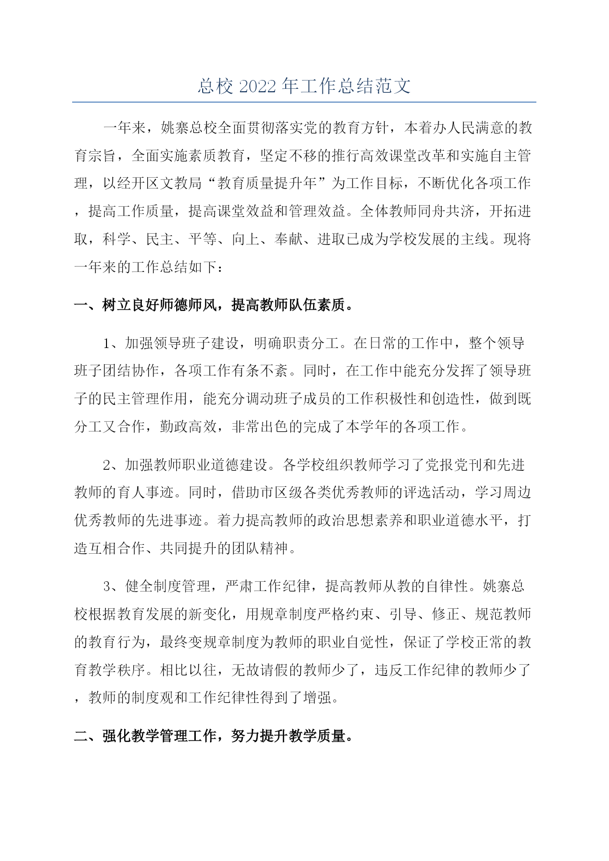 总校2022年工作总结范文一年来,姚寨总校全面贯彻落实党的教育方针,本着办人民满意的教育宗旨,全面实施素质教育,坚定不移的推行高效课堂改革和实施自主管理,以经开区文教局“教育质量提升年”为工作目标,不断优化各项工作,提高工作质量,提高课堂效益和管理效益。全体教师同舟共济,开拓进取,科学、民主、平等、向上、奉献、进取已成为学校发展的主线。现将一年来的工作总结如下:一、树立良好师德师风,提高教师队伍素质。1、加强领导班子建设,明确职责分工。在日常的工作中,整个领导班子团结协作,各项工作有条不紊。同时,在工作中