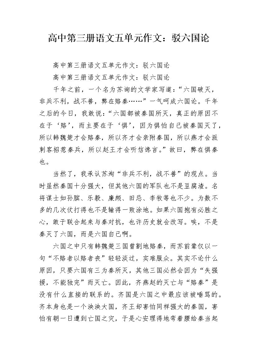 高中语文第三册五单元作文:驳《六国论》高中语文第三册五单元作文:驳《六国论》导语:《六国论》是苏洵政论文代表作品。《六国论》提出并论证了六国灭亡“弊在赂秦”的精辟论点。下面是小编为您收集整理的作文,希望对您有所帮助。【篇一:驳《六国论》】苏洵认为秦统一六国而六国亡的最主要的原因是贿赂秦国。我却认为最大的原因是秦国的君王可以知人善用。首先是秦孝公支持商鞅变法,无论商鞅变法的要求是什么。秦孝公都给大力的支持。正是由于秦孝公的大力支持,才使商鞅变法成功。正是这次变法的成功使得秦国的国力有