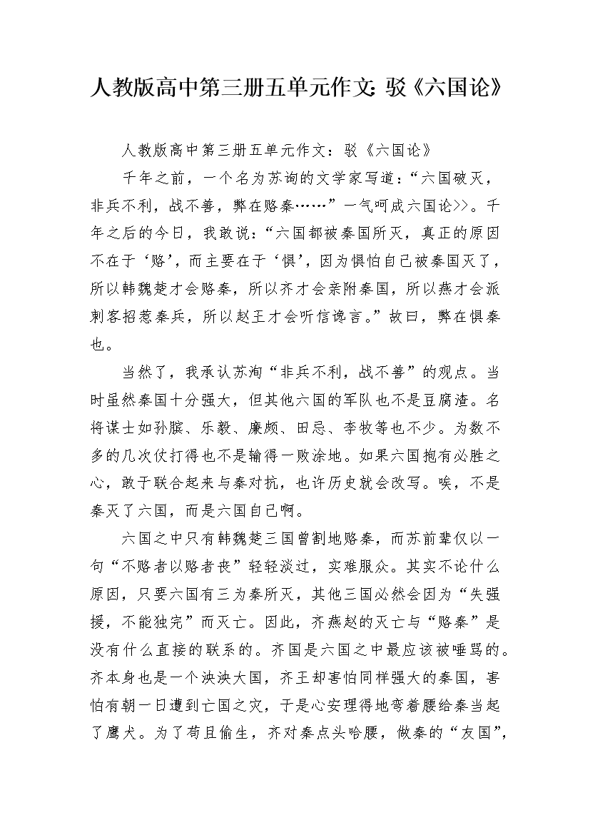 人教版高中第三册五单元作文:驳《六国论》_1.docx