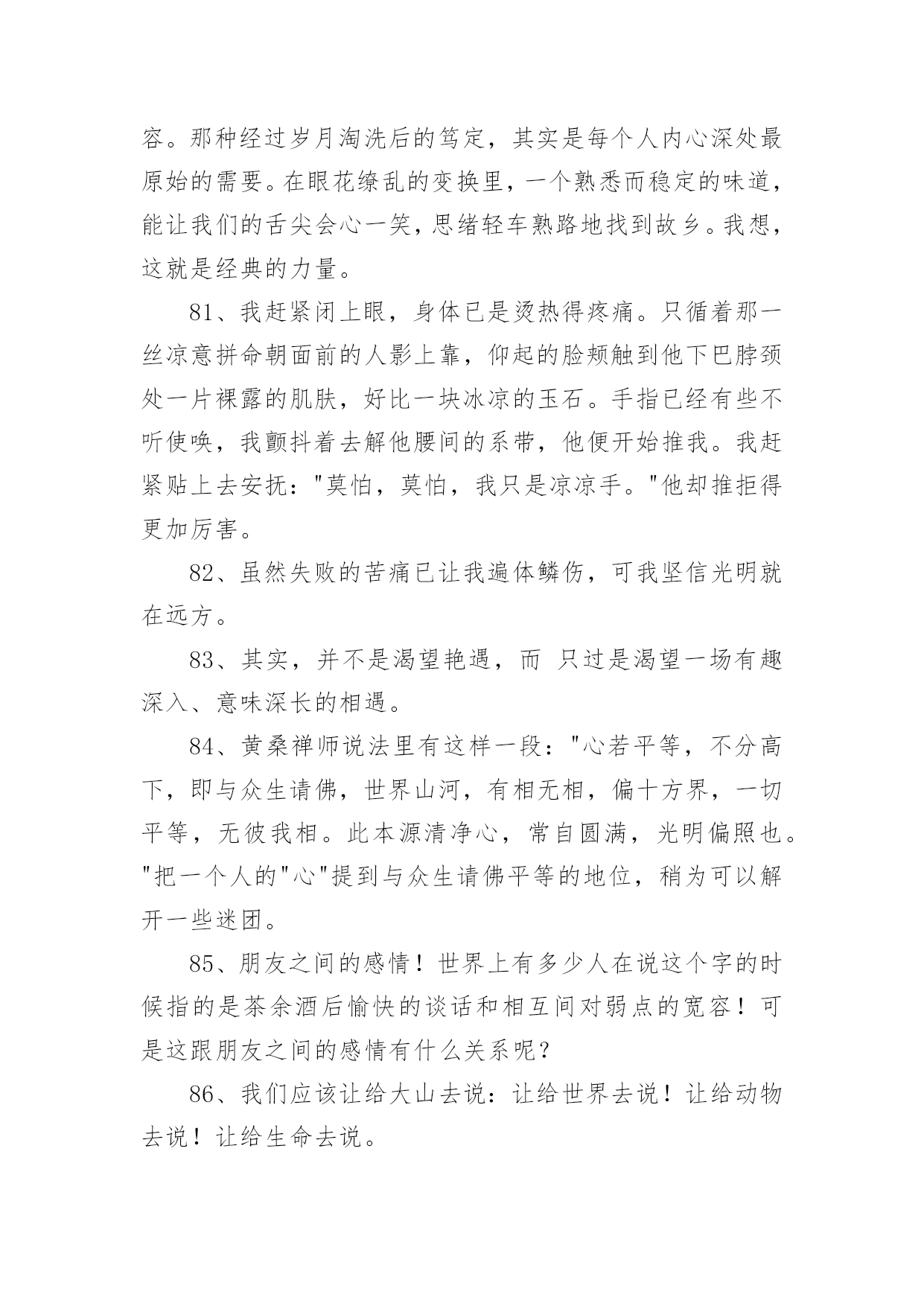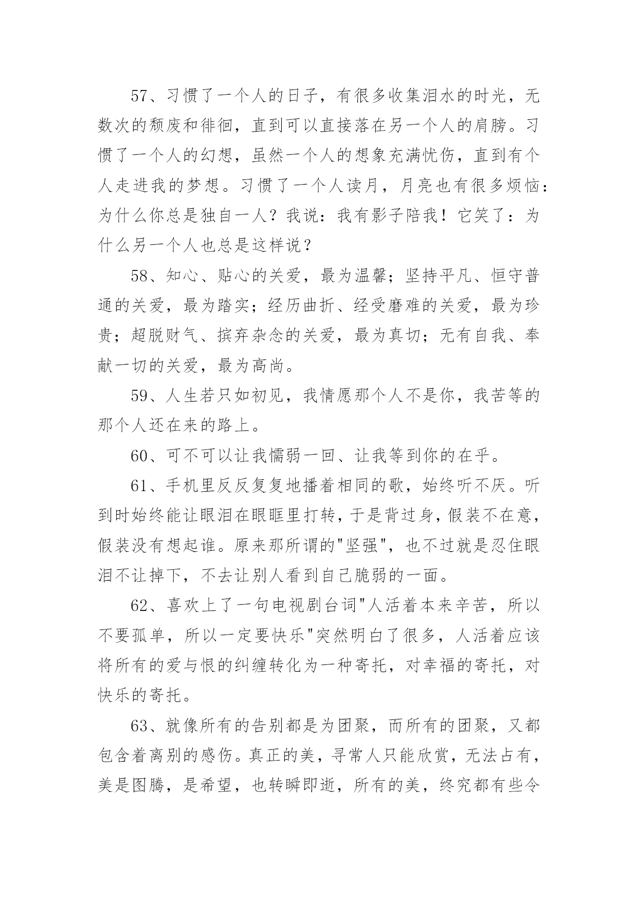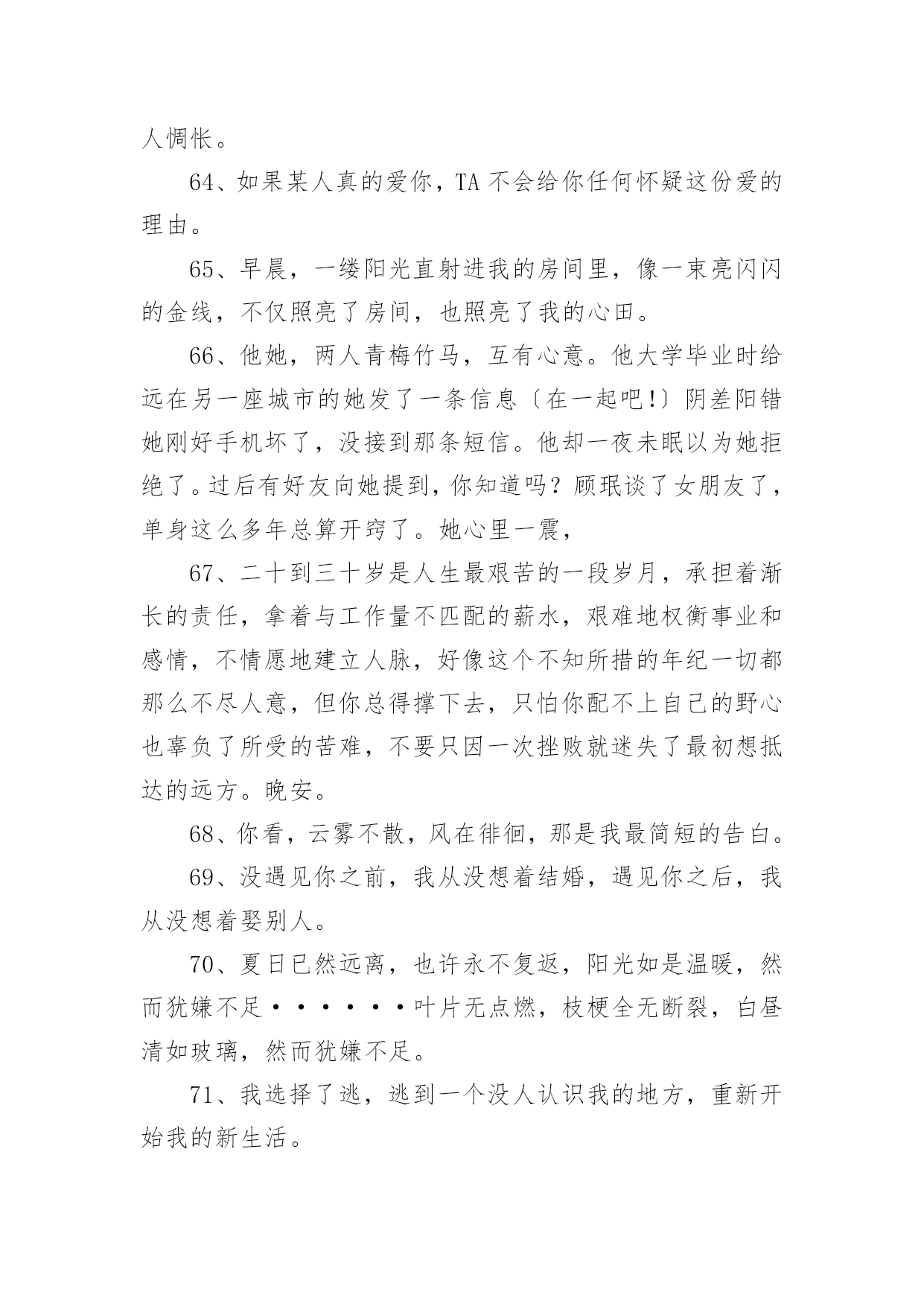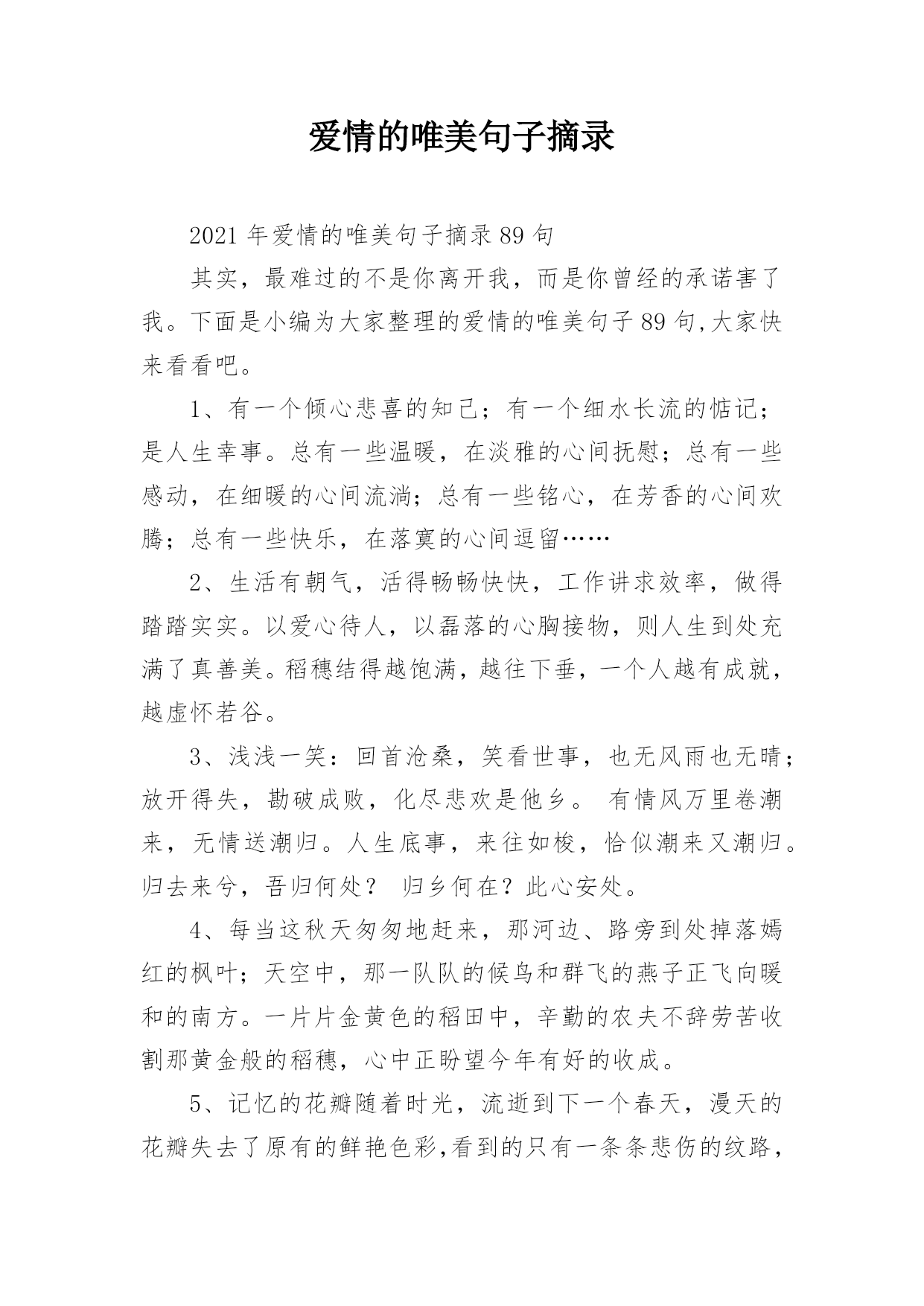 爱情的唯美句子摘录2021年爱情的唯美句子摘录89句其实,最难过的不是你离开我,而是你曾经的承诺害了我。下面是小编为大家整理的爱情的唯美句子89句,大家快来看看吧。1、有一个倾心悲喜的知己;有一个细水长流的惦记;是人生幸事。总有一些温暖,在淡雅的心间抚慰;总有一些感动,在细暖的心间流淌;总有一些铭心,在芳香的心间欢腾;总有一些快乐,在落寞的心间逗留……2、生活有朝气,活得畅畅快快,工作讲求效率,做得踏踏实实。以爱心待人,以磊落的心胸接物,则人生到处充满了真善美。稻穗结得越饱满,越往下垂,一个人越有成就,越