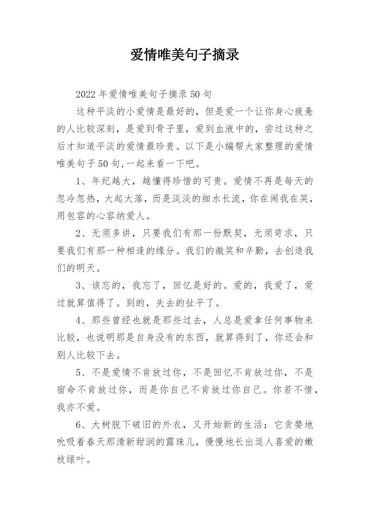 爱情唯美句子摘录2022年爱情唯美句子摘录50句这种平淡的小爱情是最好的,但是爱一个让你身心疲惫的人比较深刻,是爱到骨子里,爱到血液中的,尝过这种之后才知道平淡的爱情最珍贵。以下是小编帮大家整理的爱情唯美句子50句,一起来看一下吧。1、年纪越大,越懂得珍惜的可贵。爱情不再是每天的忽冷忽热,大起大落,而是淡淡的细水长流,你在闹我在笑,用包容的心容纳爱人。2、无须多讲,只要我们有那一份默契,无须苛求,只要我们有那一种相逢的缘分。我们的微笑和辛勤,去创造我们的明天。3、该忘的,我忘了,回忆是好的。爱的,我爱了,