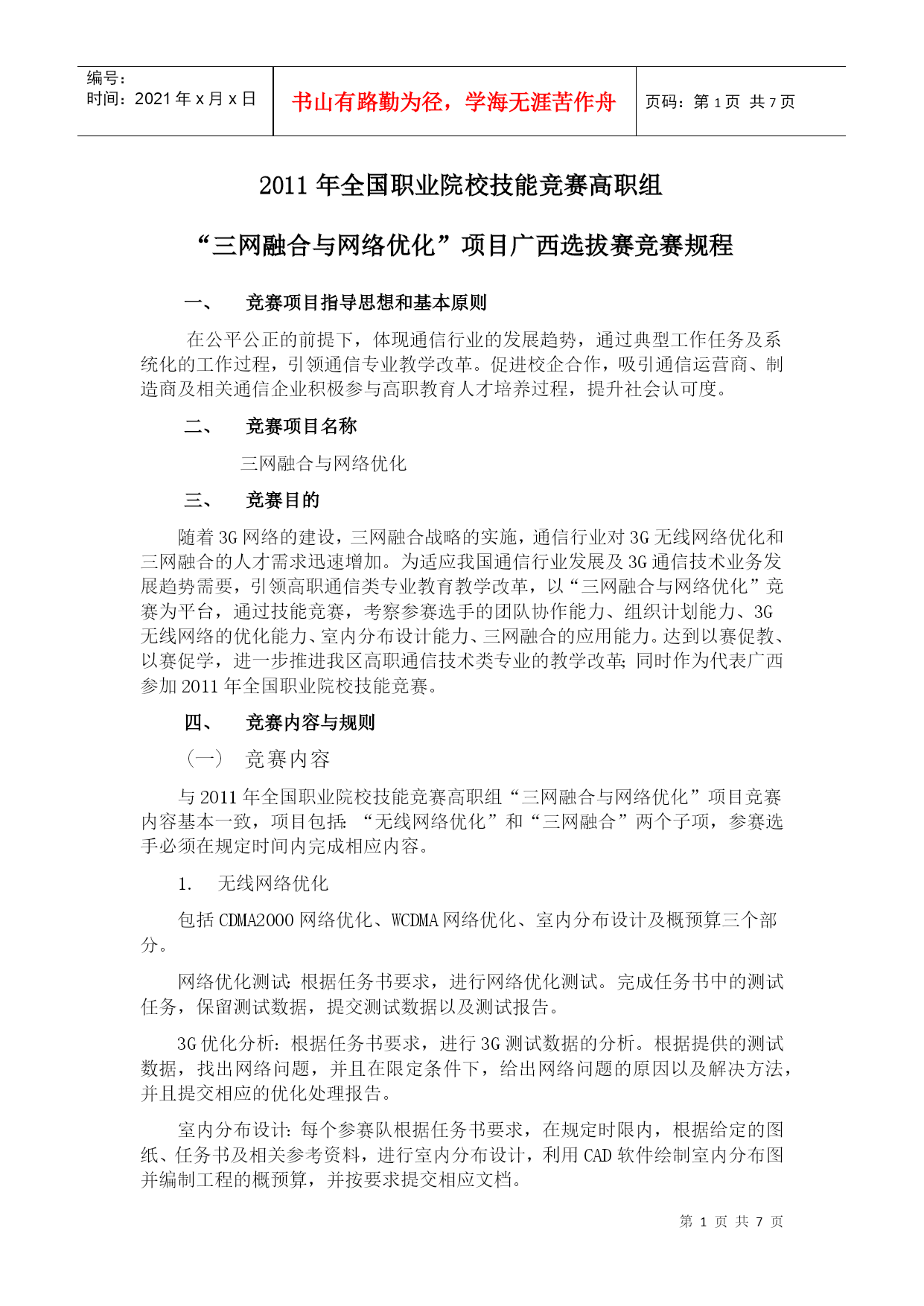 编号:时间:2021年x月x日书山有路勤为径,学海无涯苦作舟页码:第页共NUMPAGES7页第PAGE\*MERGEFORMAT7页共NUMPAGES\*MERGEFORMAT7页2011年全国职业院校技能竞赛高职组“三网融合与网络优化”项目广西选拔赛竞赛规程一、竞赛项目指导思想和基本原则在公平公正的前提下,体现通信行业的发展趋势,通过典型工作任务及系统化的工作过程,引领通信专业教学改革。促进校企合作,吸引通信运营商、制造商及相关通信企业积极参与高职教育人才培养过程,提升社会认可度。二、