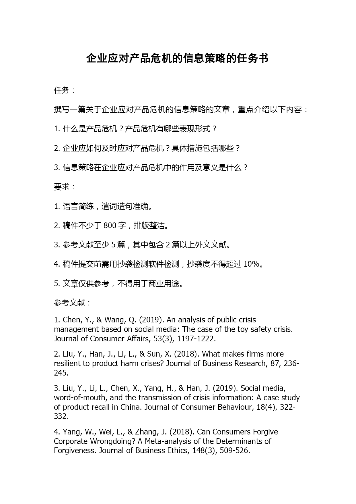 企业应对产品危机的信息策略的任务书任务:撰写一篇关于企业应对产品危机的信息策略的文章,重点介绍以下内容:1.什么是产品危机?产品危机有哪些表现形式?2.企业应如何及时应对产品危机?具体措施包括哪些?3.信息策略在企业应对产品危机中的作用及意义是什么?要求:1.语言简练,遣词造句准确。2.稿件不少于800字,排版整洁。3.参考文献至少5篇,其中包含2篇以上外文文献。4.稿件提交前需用抄袭检测软件检测,抄袭度不得超过10%。5.文章仅供参考,不得用于商业用途。参考文献:1.Chen,Y.,&Wang,Q.(2