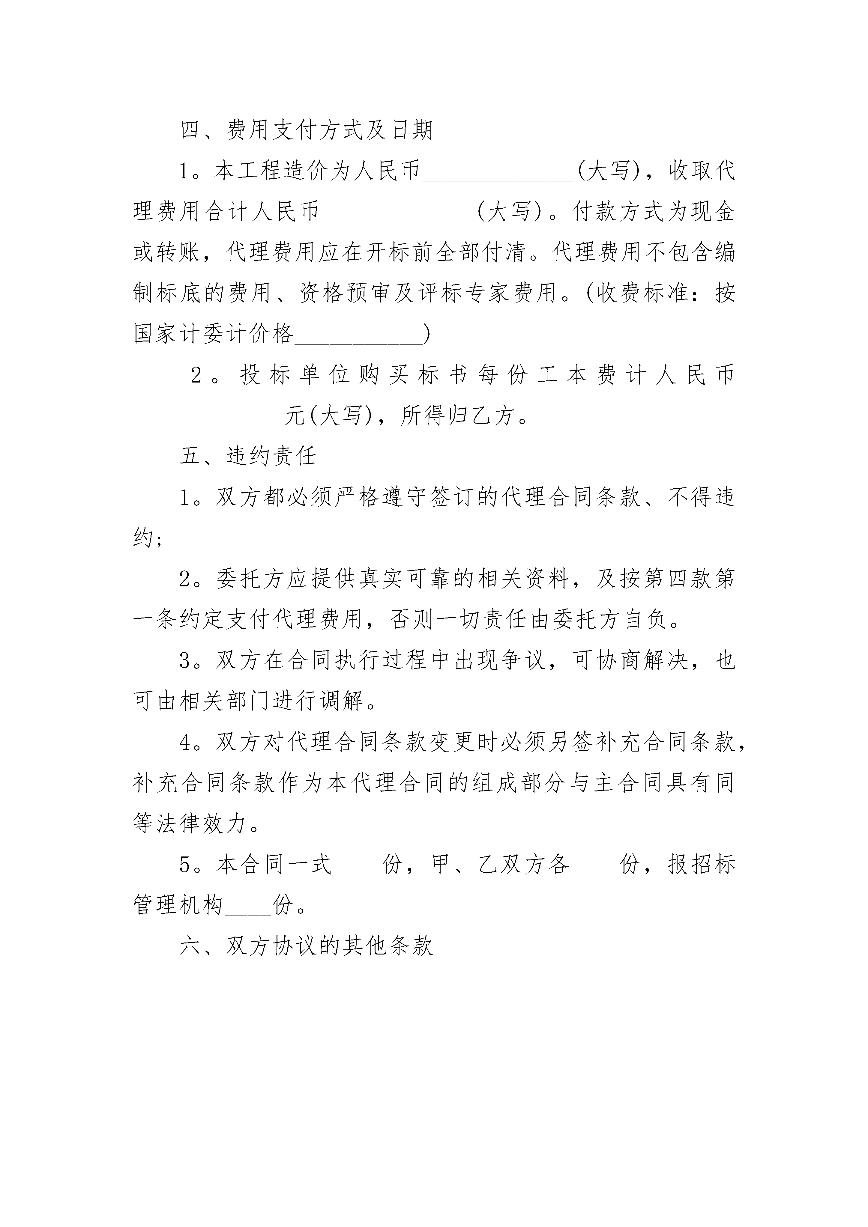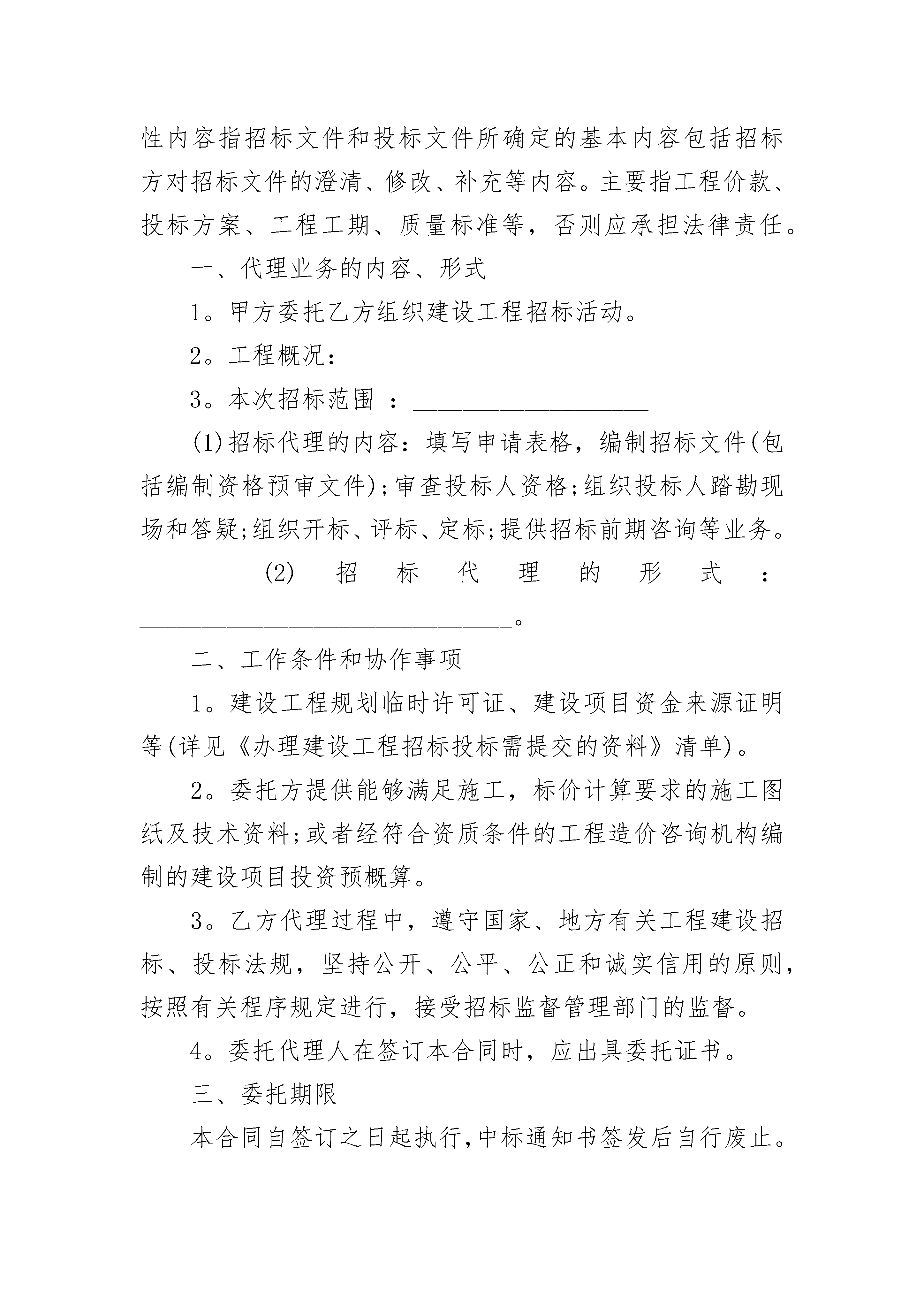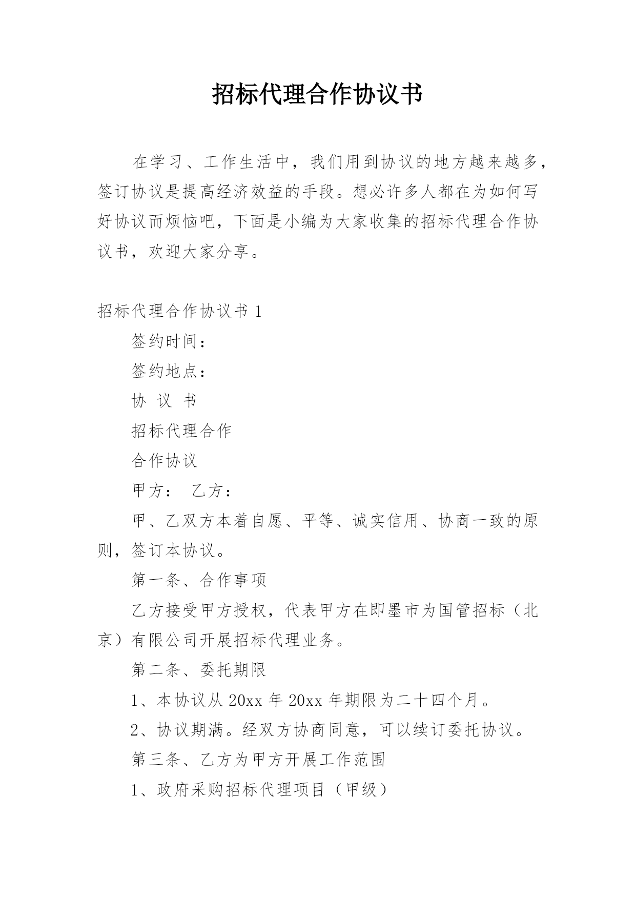 招标代理合作协议书在学习、工作生活中,我们用到协议的地方越来越多,签订协议是提高经济效益的手段。想必许多人都在为如何写好协议而烦恼吧,下面是小编为大家收集的招标代理合作协议书,欢迎大家分享。招标代理合作协议书1签约时间:签约地点:协议书招标代理合作合作协议甲方:乙方:甲、乙双方本着自愿、平等、诚实信用、协商一致的原则,签订本协议。第一条、合作事项乙方接受甲方授权,代表甲方在即墨市为国管招标(北京)有限公司开展招标代理业务。第二条、委托期限1、本协议从20xx年20xx年期限为二十四个月。2、协议期满。经双