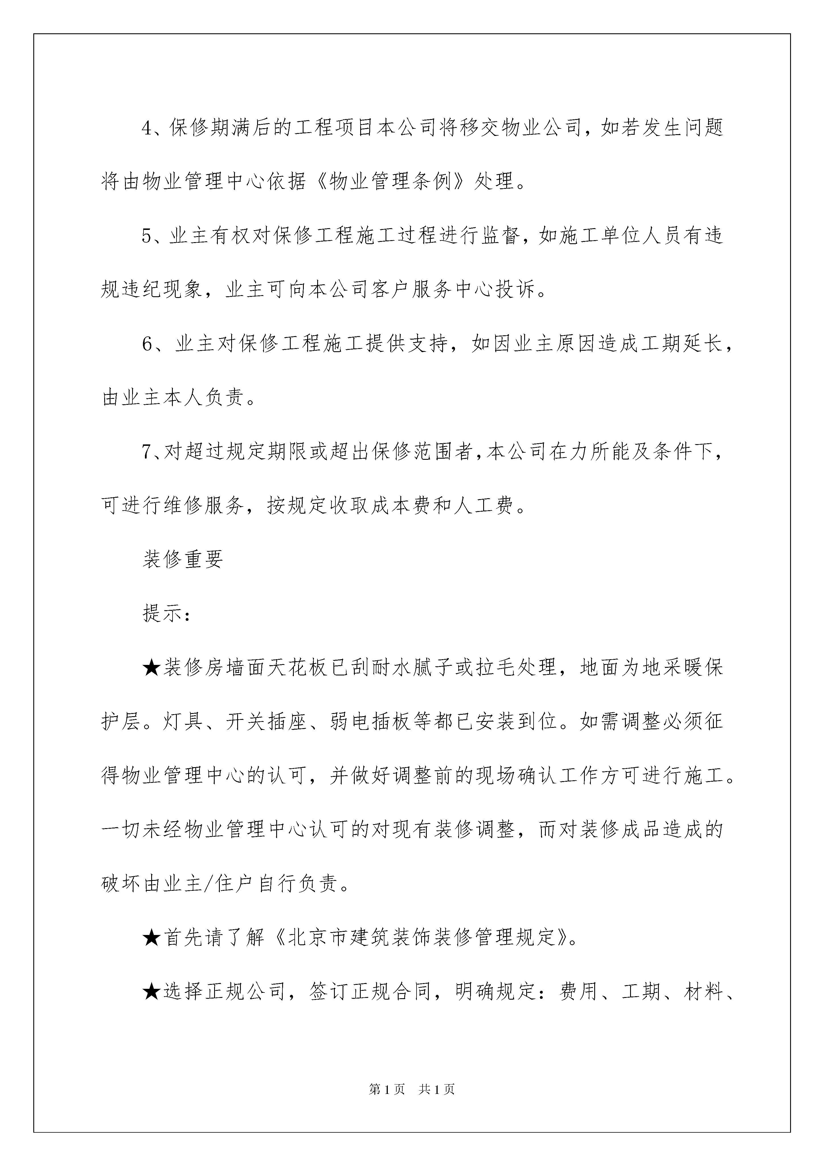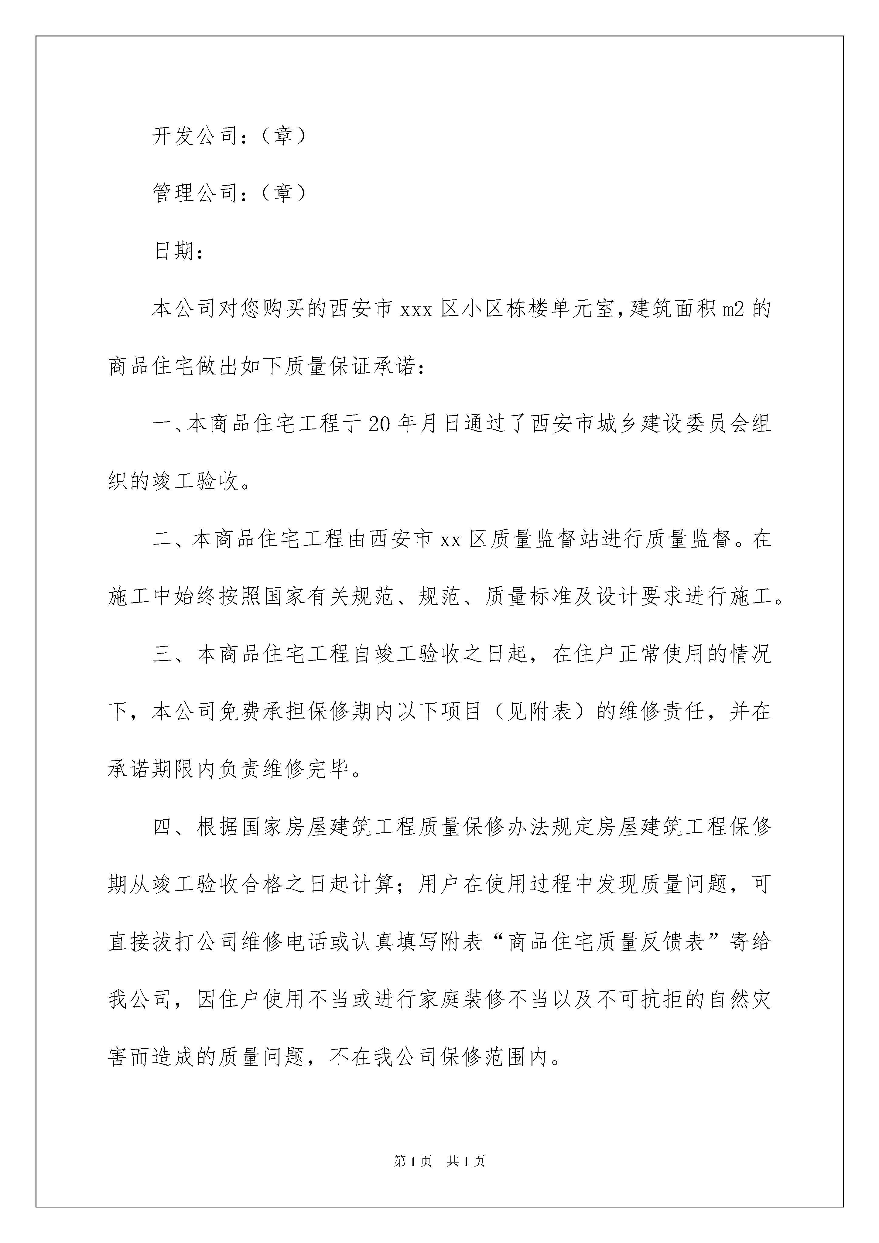 关于住宅质量保证书范文锦集十篇关于住宅质量保证书范文锦集十篇住宅质量保证书篇1质量验收:建设单位:设计单位:监理单位:施工单位:本工程经四方验收评定为合格,已在质量监督站备案登记。本公司和物业管理公司做了交接验收。质量保证:地产开发有限公司承担住宅小区的质量保证。该物业遵照国家现行规范进行设计、施工、并通过工程质量竣工验收及评定,质量满足国家验收规范要求,准予交付使用。地产开发有限公司承诺遵守国家建设工程保修规定和北京市建筑装修管理规定,在保修期内承担保修义务。业主入户时,本公司将签发本质量保证书,业主申