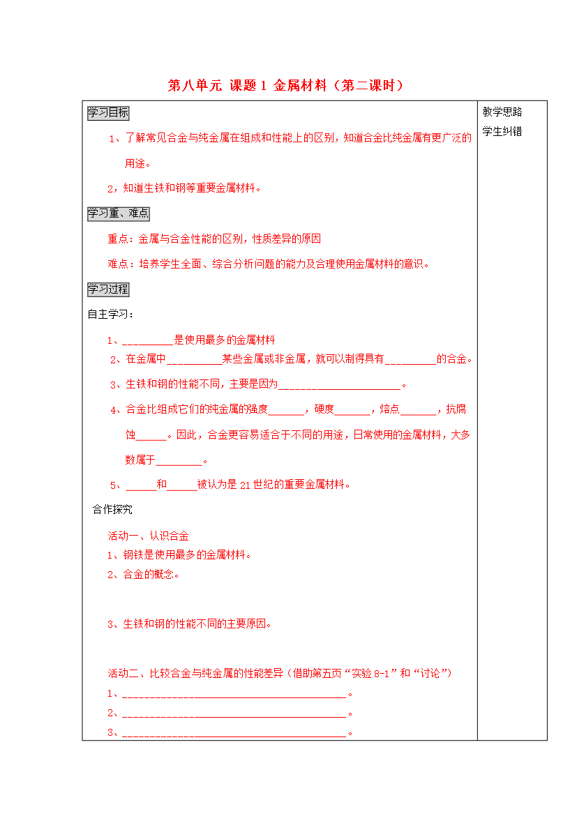 第八单元课题1金属材料(第二课时)学习目标1、了解常见合金与纯金属在组成和性能上的区别知道合金比纯金属有更广泛的用途。2知道生铁和钢等重要金属材料。学习重、难点重点:金属与合金性能的区别性质差异的原因难点:培养学生全面、综合分析问题的能力及合理使用金属材料的意识。学习过程自主学习:1、__________是使用最多的金属材料2、在金属中___________某些金属或非金属就可以制得具有__________的合金。3、生铁和钢的性能不同主要是因为________________________。4、合