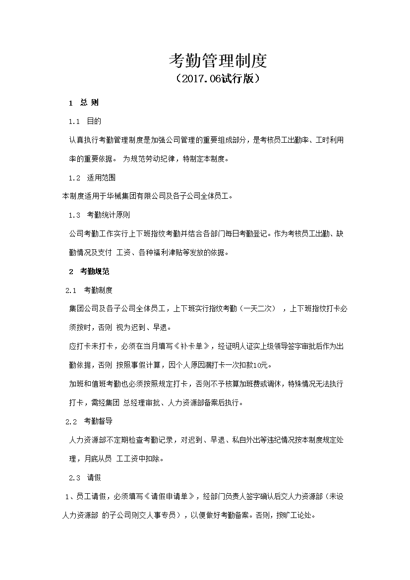 考勤管理制度(2017.06试行版)1总则1.1目的认真执行考勤管理制度是加强公司管理的重要组成部分是考核员工出勤率、工时利用率的重要依据。为规范劳动纪律特制定本制度。1.2适用范围本制度适用于华械集团有限公司及各子公司全体员工。1.3考勤统计原则公司考勤工作实行上下班指纹考勤并结合各部门每日考勤登记。作为考核员工出勤、缺勤情况及支付工资、各种福利津贴等发放的依据。2考勤规范2.1考勤制度集团公司及各子公司全体员工上下班实行指纹考勤(一天二次)上下班指纹打卡必须按时否则