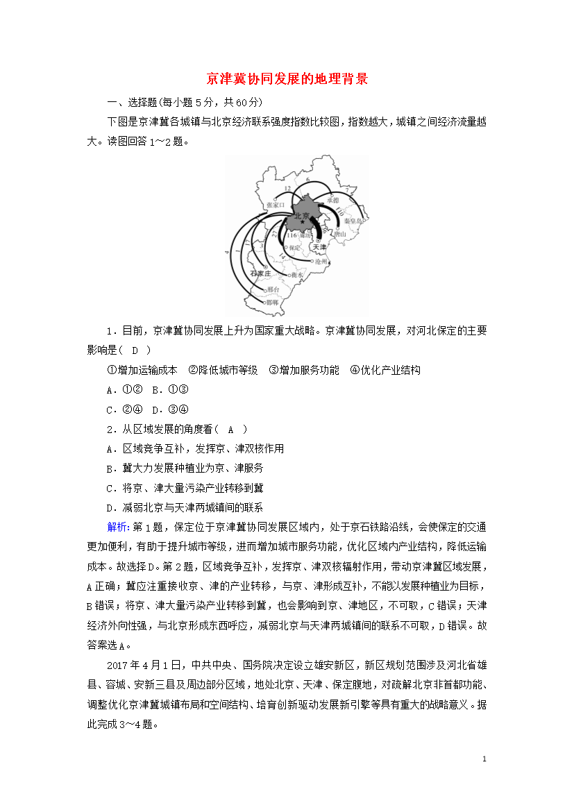 京津冀协同发展的地理背景一、选择题(每小题5分,共60分)下图是京津冀各城镇与北京经济联系强度指数比较图,指数越大,城镇之间经济流量越大。读图回答1~2题。1.目前,京津冀协同发展上升为国家重大战略。京津冀协同发展,对河北保定的主要影响是(D)①增加运输成本②降低城市等级③增加服务功能④优化产业结构A.①②B.①③C.②④D.③④2.从区域发展的角度看(A)A.区域竞争互补,发挥京、津双核作用B.冀大力发展种植业为京、津服务C.将京、津大量污染产业转移到冀D.减弱北京与天津两城镇间的联系解析:第1题,保定