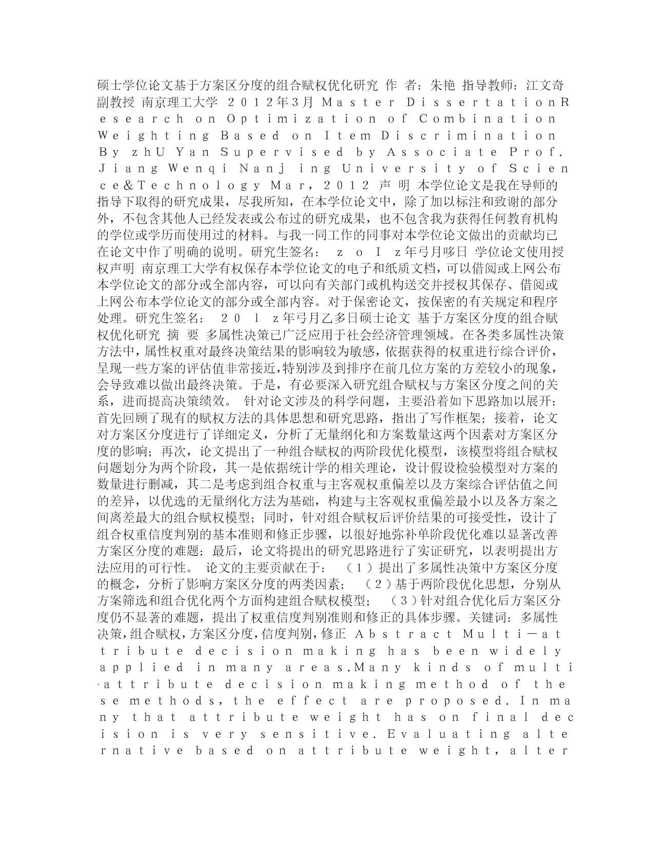 硕士学位论文基于方案区分度的组合赋权优化研究作者:朱艳指导教师:江文奇副教授南京理工大学2012年3月MasterDissertationResearchonOptimizationofCombinationWeightingBasedonItemDiscriminationByzhUYanSupervisedbyAssociateProf.JiangWenqiNanjingUniversityofScience&TechnologyMar,2012声明本学位论文是我在导师的指导下取得的研究成果,尽我所知