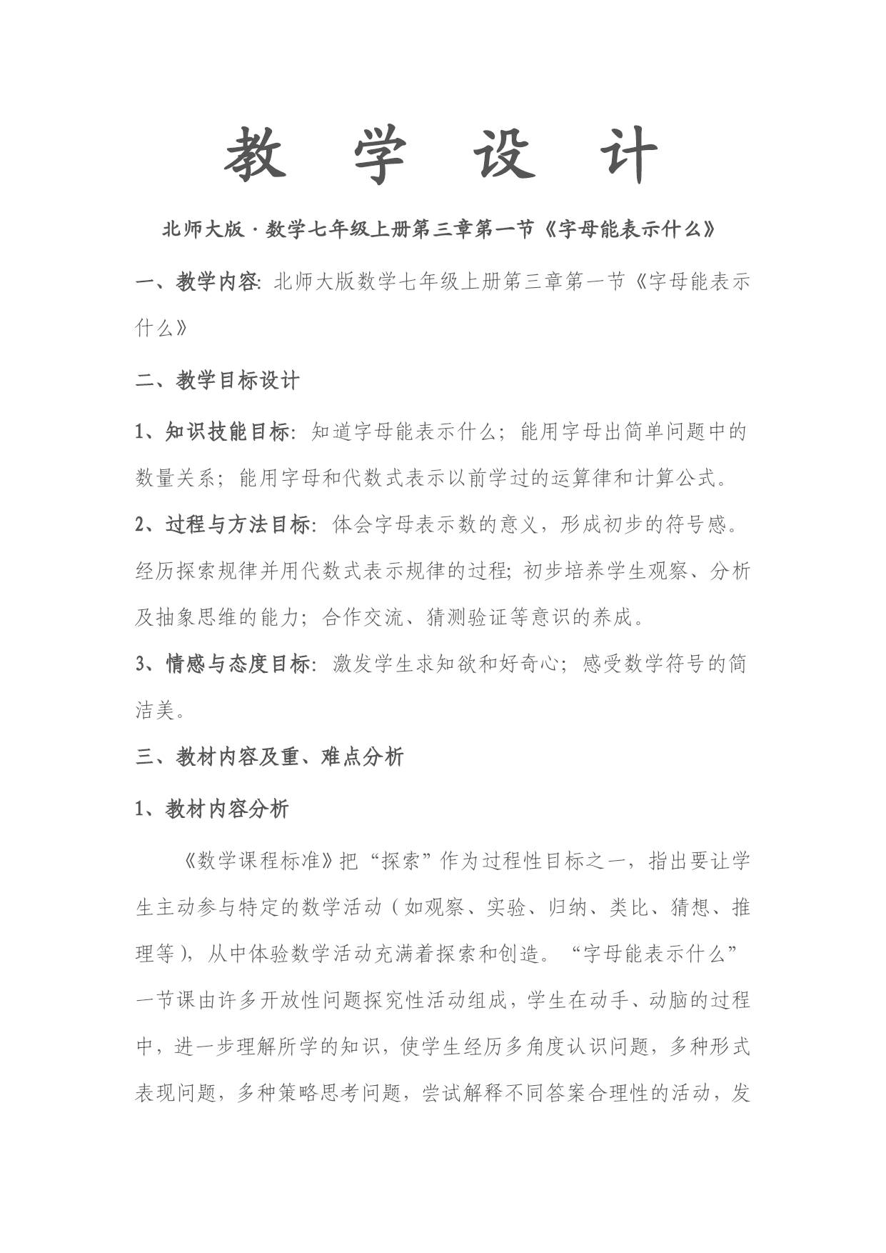 教学设计北师大版·数学七年级上册第三章第一节《字母能表示什么》一、教学内容:北师大版数学七年级上册第三章第一节《字母能表示什么》二、教学目标设计1、知识技能目标:知道字母能表示什么;能用字母出简单问题中的数量关系;能用字母和代数式表示以前学过的运算律和计算公式。2、过程与方法目标:体会字母表示数的意义,形成初步的符号感。经历探索规律并用代数式表示规律的过程;初步培养学生观察、分析及抽象思维的能力;合作交流、猜测验证等意识的养成。3、情感与态度目标:激发学生求知欲和好奇心;感受数学符号的简洁美。三、教材内容