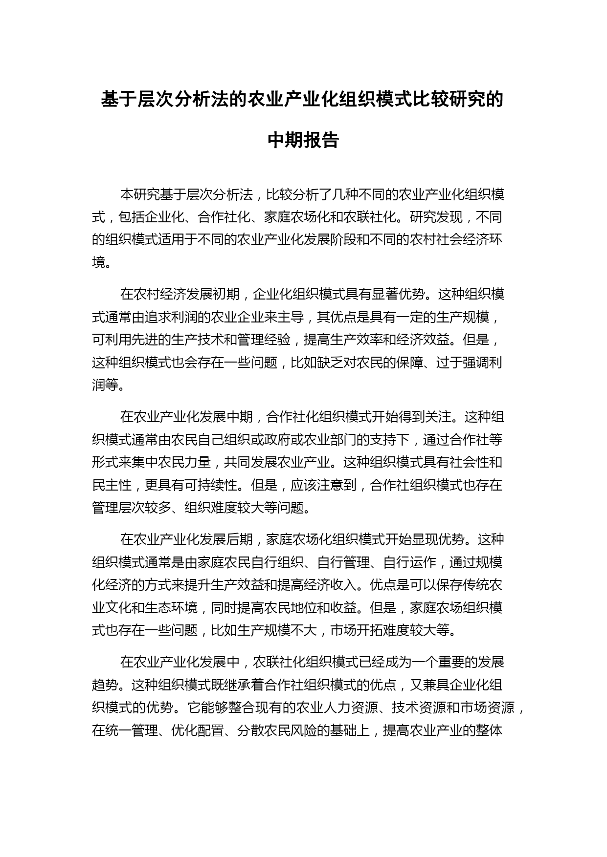基于层次分析法的农业产业化组织模式比较研究的中期报告.docx