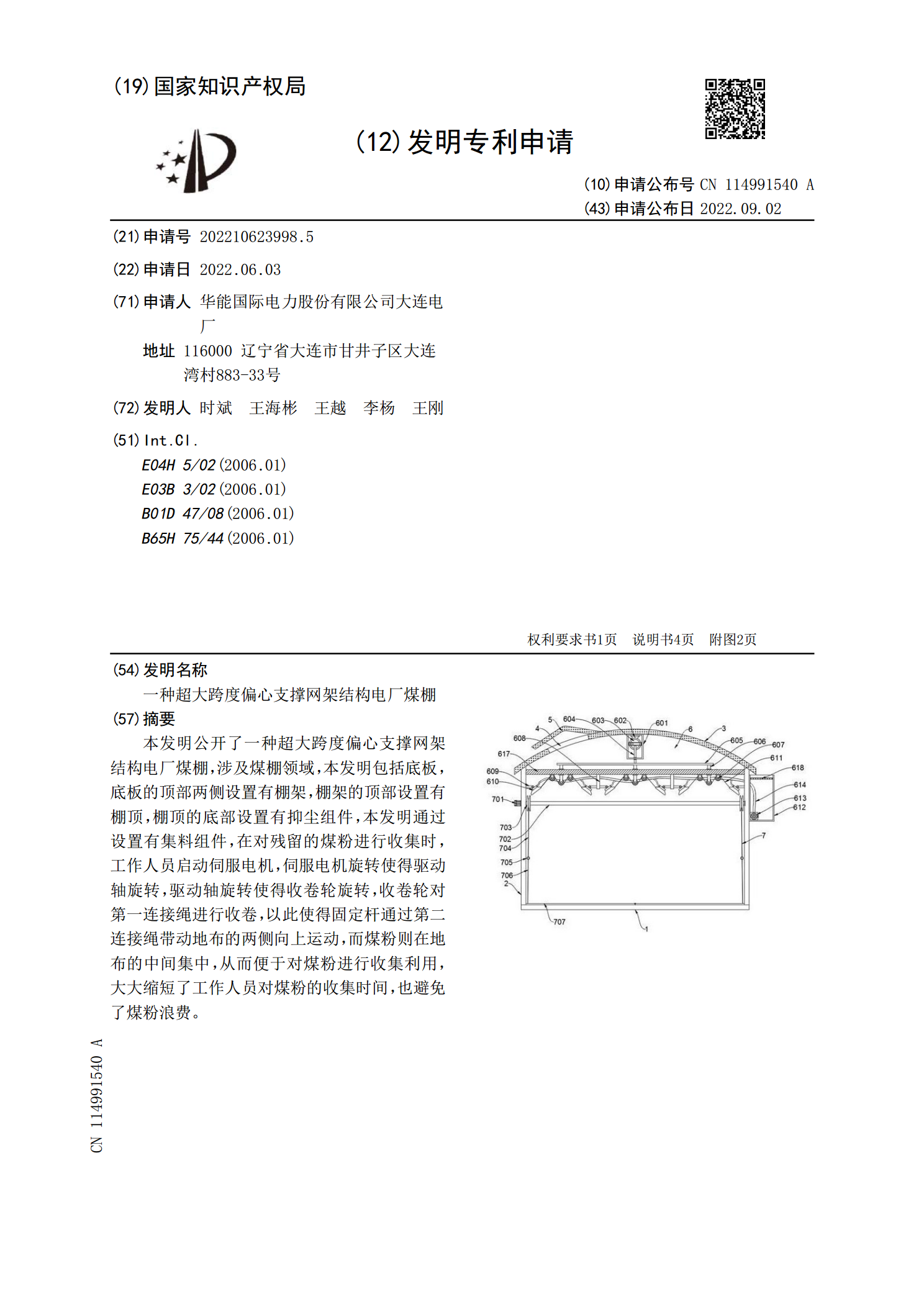 本发明公开了一种超大跨度偏心支撑网架结构电厂煤棚,涉及煤棚领域,本发明包括底板,底板的顶部两侧设置有棚架,棚架的顶部设置有棚顶,棚顶的底部设置有抑尘组件,本发明通过设置有集料组件,在对残留的煤粉进行收集时,工作人员启动伺服电机,伺服电机旋转使得驱动轴旋转,驱动轴旋转使得收卷轮旋转,收卷轮对第一连接绳进行收卷,以此使得固定杆通过第二连接绳带动地布的两侧向上运动,而煤粉则在地布的中间集中,从而便于对煤粉进行收集利用,大大缩短了工作人员对煤粉的收集时间,也避免了煤粉浪费。
