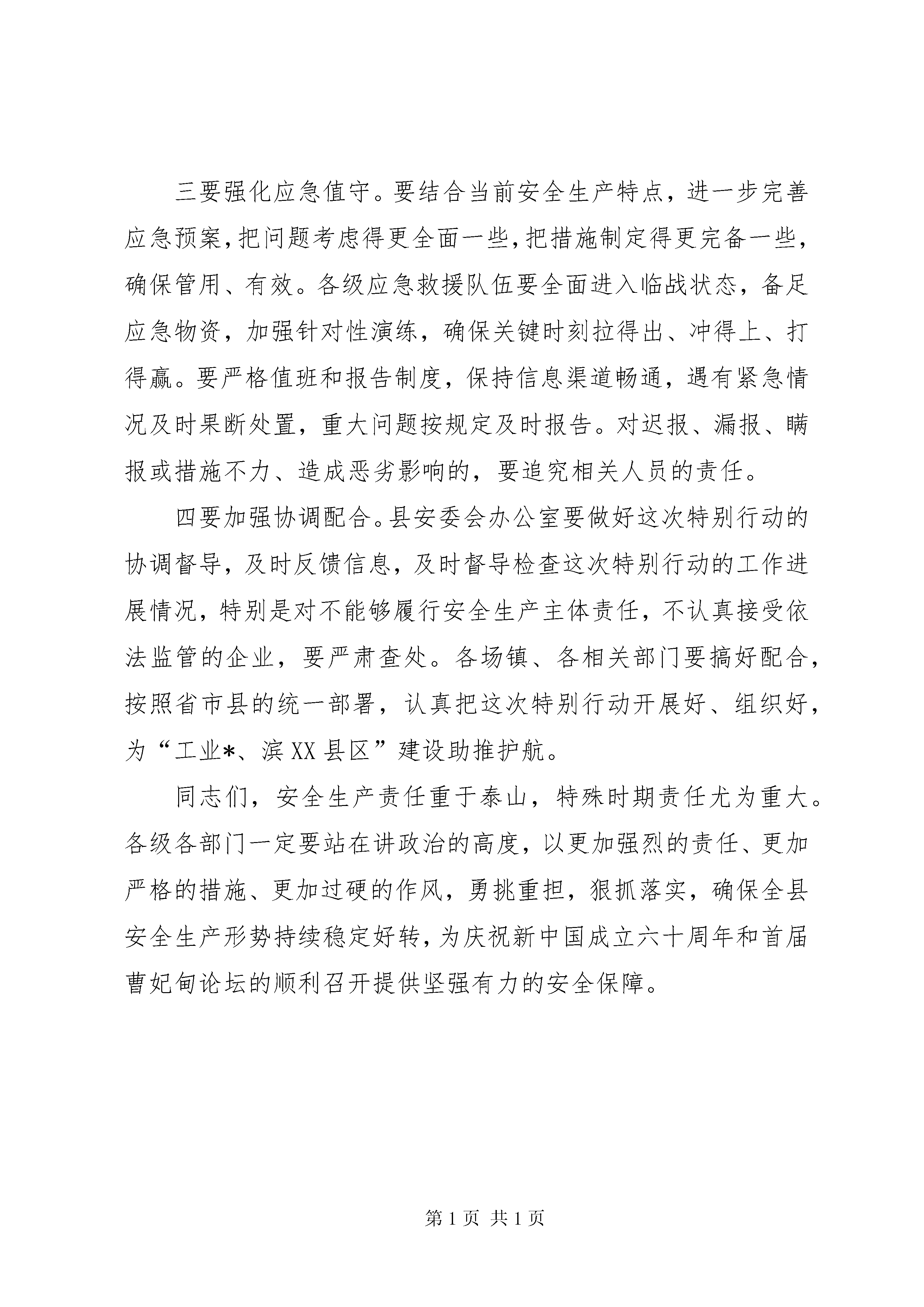 第PAGE\*Arabic\*MERGEFORMAT6页共NUMPAGES\*MERGEFORMAT6页县安全生产执法检查动员会议讲话为了贯彻落实好省市安全生产执法检查特别行动电视电话会议精神,按照省市要求,今天我们召开这次“安全迎国庆,平安保论坛”全县安全生产执法检查特别行动动员会议,标志着我县安全生产执法检查特别行动正式启动。刚才,全民县长宣读了《安全生产执法检查特别行动方案》,对我县开展安全生产执法检查特别行动进行了安排布置。希望大家按照《方案》要求,认真抓好落实。下面,就如何贯彻落实好