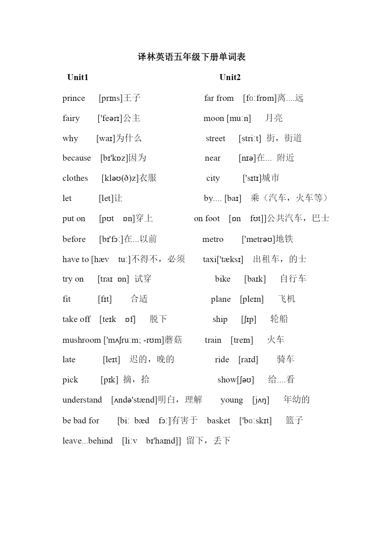 ..译林英语五年级下册单词表Unit1Unit2prince[prɪns]王子farfrom[fɑːfrɒm]离....远fairy['feərɪ]公主moon[muːn]月亮why[waɪ]为什么street[striːt]街,街道because[bɪ'kɒz]因为near[nɪə]在...附近clothes[kləʊ(ð)z]衣服city['sɪtɪ]城市let[let]让by....[baɪ]乘(汽车,火车等)puton[pʊtɒn]穿上onfoot[ɒnfʊt]]公共汽车,巴士before[bɪ'