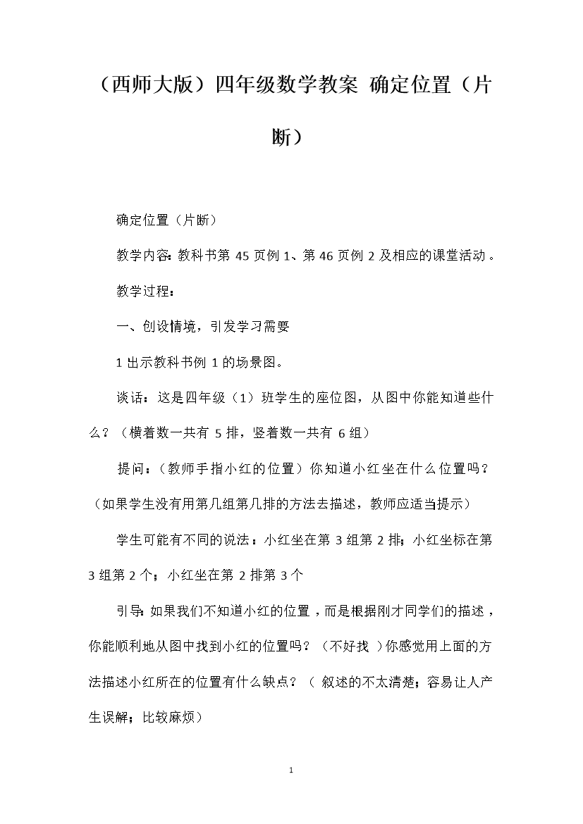 确定位置(片断)教学内容:教科书例1、例2及相应的课堂活动。教学过程:一、创设情境,引发学习需要1出示教科书例1的场景图。谈话:这是四年级(1)班学生的座位图,从图中你能知道些什么?(横着数一共有5排,竖着数一共有6组)提问:(教师手指小红的位置)你知道小红坐在什么位置吗?(如果学生没有用“第几组第几排”的方法去描述,教师应适当提示)学生可能有不同的说法:小红坐在第3组第2排;小红坐标在第3组第2个;小红坐在第2排第3个……引导:如果我们不知道小红的位置,而是根据刚才同学们的描述,你能顺利地从图中找到小