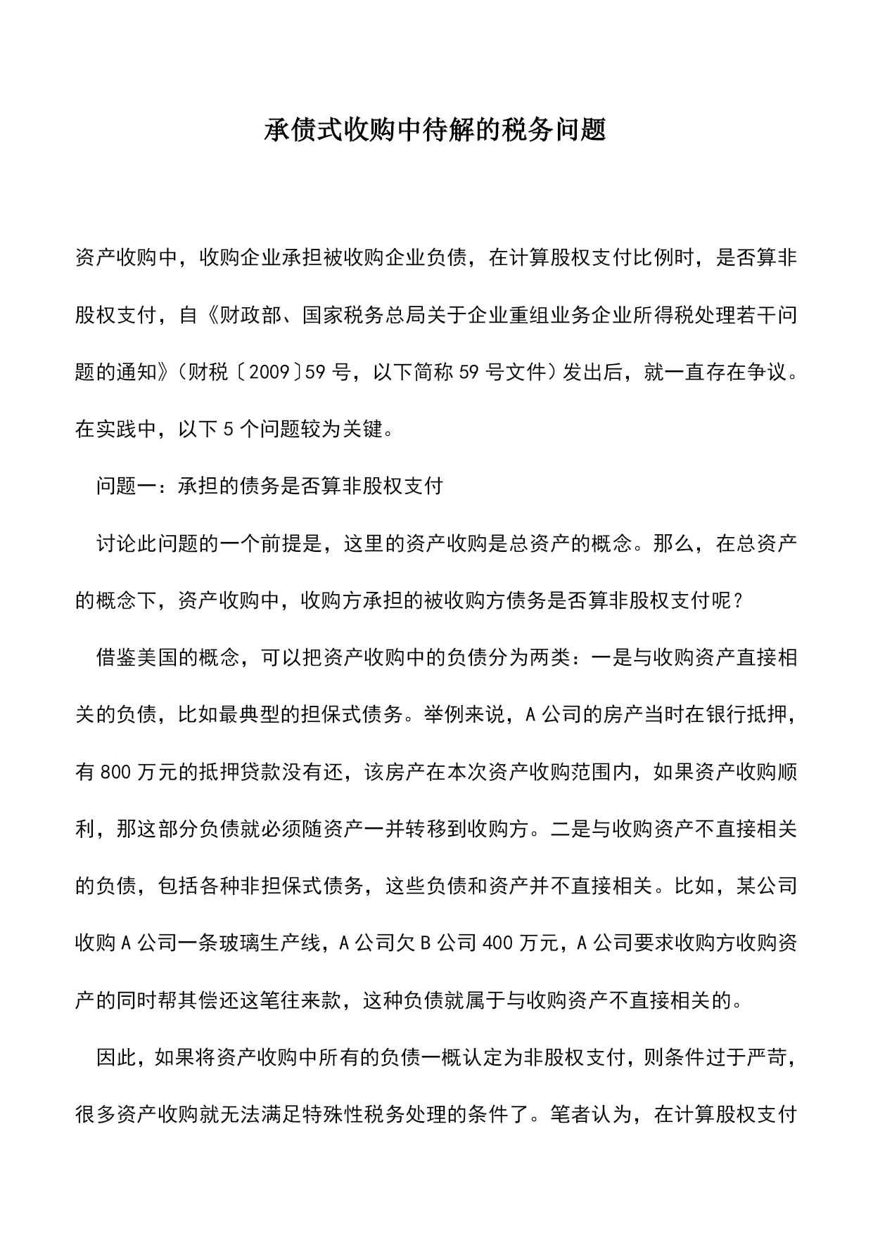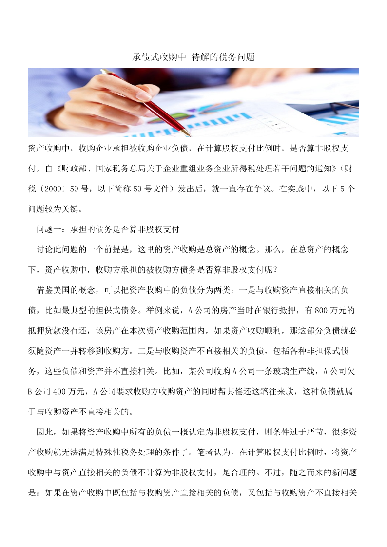 承债式收购中待解的税务问题资产收购中,收购企业承担被收购企业负债,在计算股权支付比例时,是否算非股权支付,自《财政部、国家税务总局关于企业重组业务企业所得税处理若干问题的通知》(财税〔2009〕59号,以下简称59号文件)发出后,就一直存在争议。在实践中,以下5个问题较为关键。问题一:承担的债务是否算非股权支付讨论此问题的一个前提是,这里的资产收购是总资产的概念。那么,在总资产的概念下,资产收购中,收购方承担的被收购方债务是否算非股权支付呢?借鉴美国的概念,可以把资产收购中的负债分为两类:一是与收购资产直
