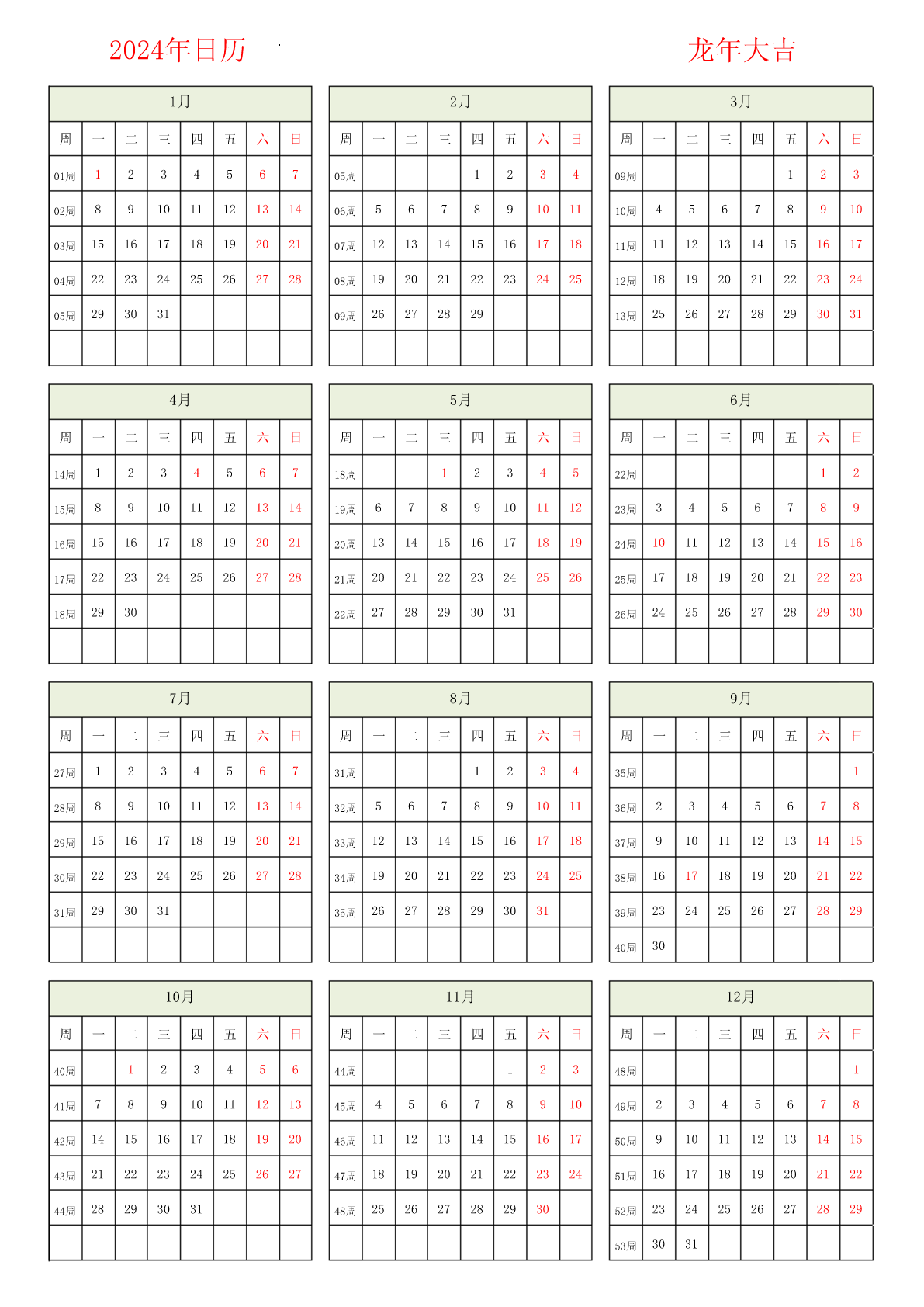 2024年日历龙年大吉1月2月3月周一二三四五六日周一二三四五六日周一二三四五六日01周123456705周123409周12302周89101112131406周56789101110周4567891003周1516171819202107周1213141516171811周1112131415161704周2223242526272808周1920212223242512周1819202122232405周29303109周2627282913周252627282930314月5月6月周一二三四五六日