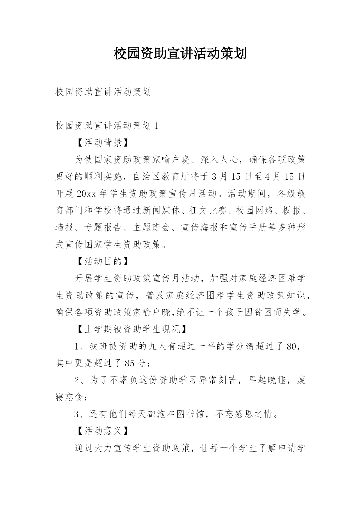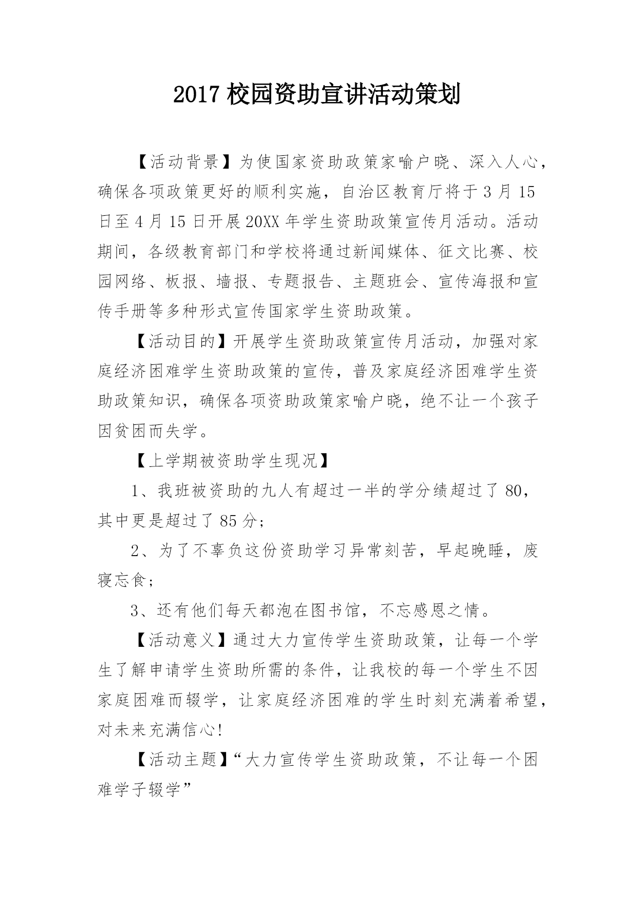 2017校园资助宣讲活动策划2017校园资助宣讲活动策划范文1【活动背景】为使国家资助政策家喻户晓、深入人心,确保各项政策更好的顺利实施,自治区教育厅将于3月15日至4月15日开展20XX年学生资助政策宣传月活动。活动期间,各级教育部门和学校将通过新闻媒体、征文比赛、校园网络、板报、墙报、专题报告、主题班会、宣传海报和宣传手册等多种形式宣传国家学生资助政策。【活动目的】开展学生资助政策宣传月活动,加强对家庭经济困难学生资助政策的宣传,普及家庭经济困难学生资助政策知识,确保各项资助政策家喻户晓,绝不让一个孩
