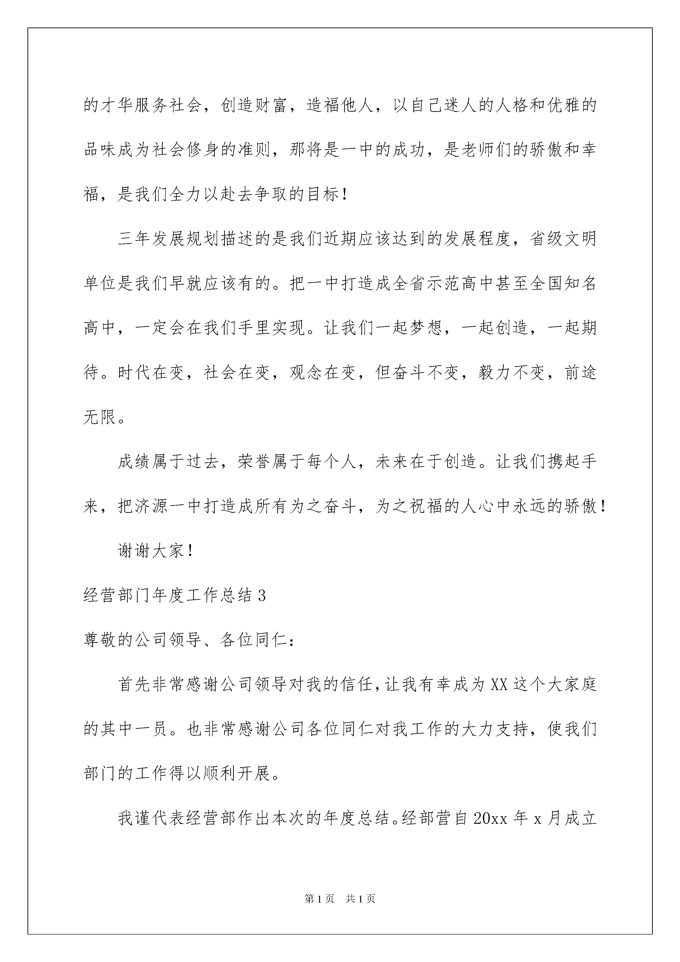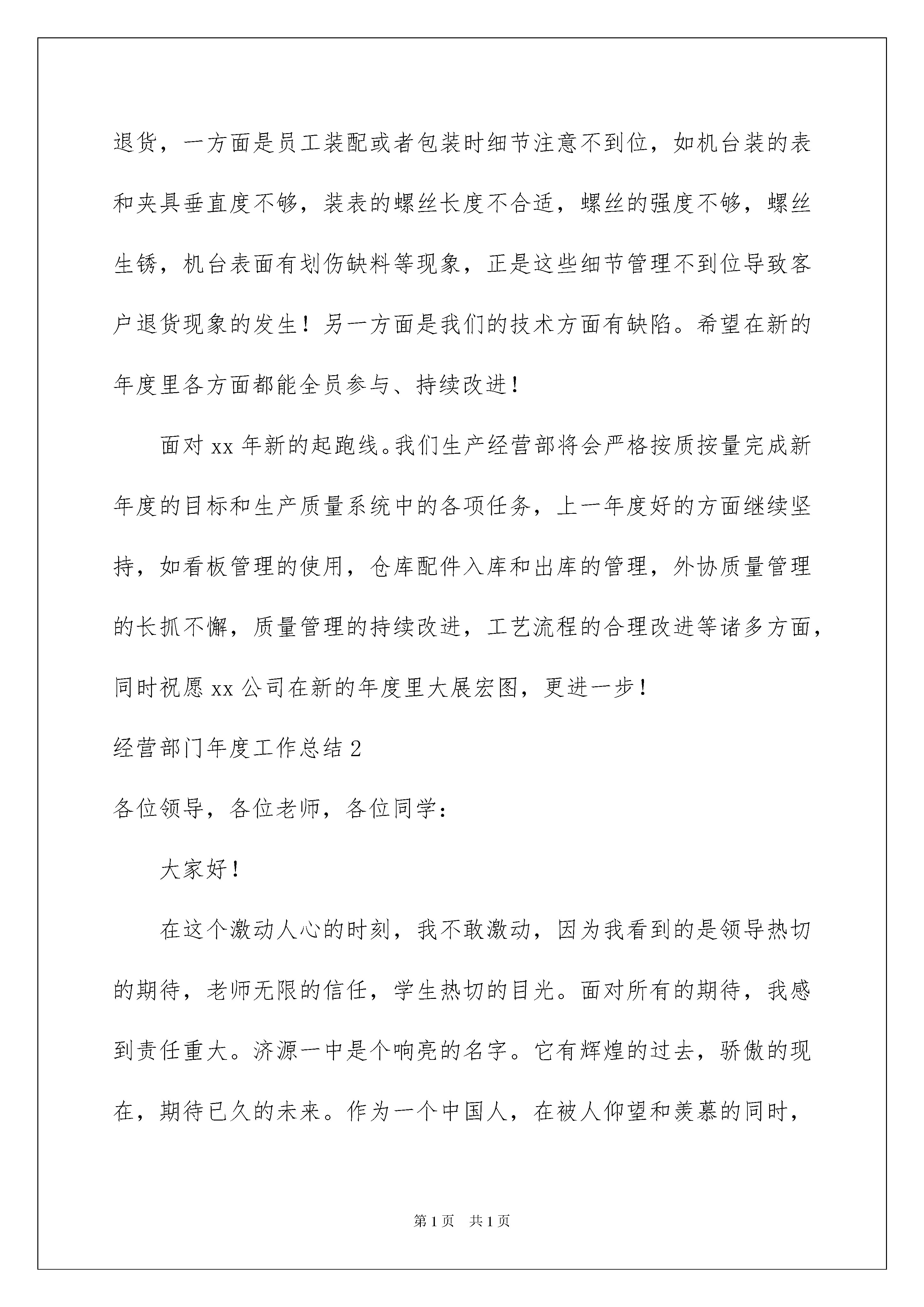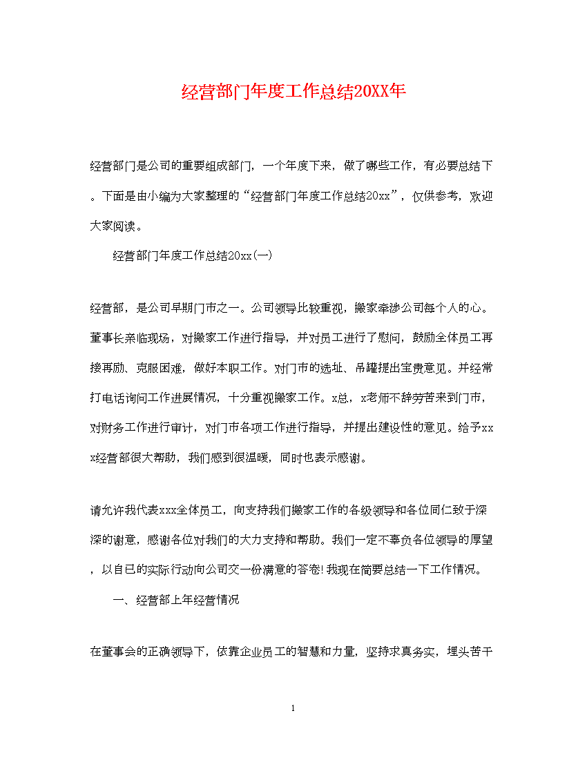 此资料由网络收集而来,如有侵权请告知上传者立即删除。资料共分享,我们负责传递知识。经营部门年度工作总结20XX年经营部门是公司的重要组成部门,一个年度下来,做了哪些工作,有必要总结下。下面是由小编为大家整理的“经营部门年度工作总结20xx”,仅供参考,欢迎大家阅读。经营部门年度工作总结20xx(一)经营部,是公司早期门市之一。公司领导比较重视,搬家牵涉公司每个人的心。董事长亲临现场,对搬家工作进行指导,并对员工进行了慰问,鼓励全体员工再接再励、克服困难,做好本职工作。对门市的选址、吊罐提出宝贵意见。并经常