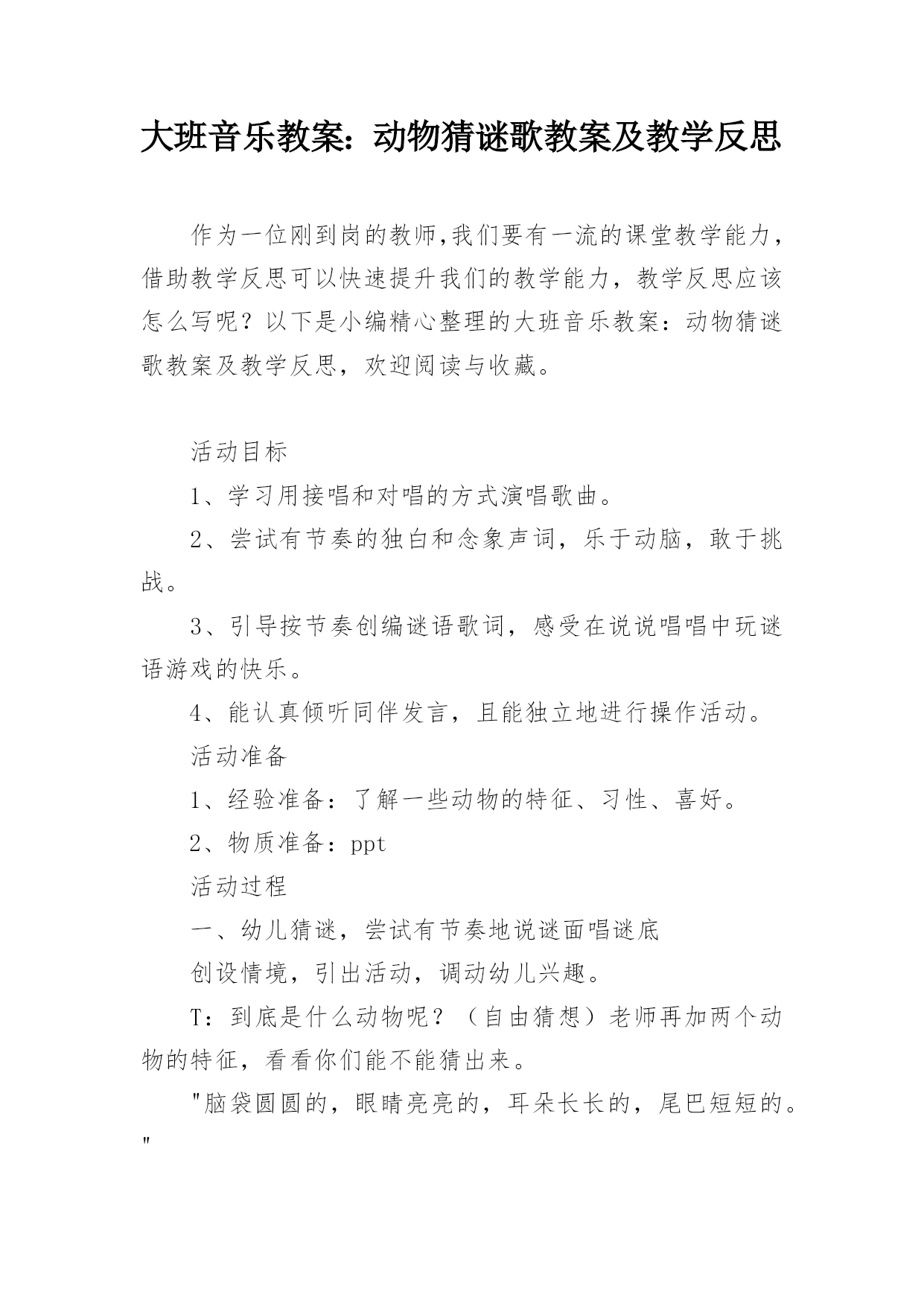 大班音乐教案:动物猜谜歌教案及教学反思作为一位刚到岗的教师,我们要有一流的课堂教学能力,借助教学反思可以快速提升我们的教学能力,教学反思应该怎么写呢?以下是小编精心整理的大班音乐教案:动物猜谜歌教案及教学反思,欢迎阅读与收藏。活动目标1、学习用接唱和对唱的方式演唱歌曲。2、尝试有节奏的独白和念象声词,乐于动脑,敢于挑战。3、引导按节奏创编谜语歌词,感受在说说唱唱中玩谜语游戏的快乐。4、能认真倾听同伴发言,且能独立地进行操作活动。活动准备1、经验准备:了解一些动物的特征、习性、喜好。2、物质准备:ppt活动