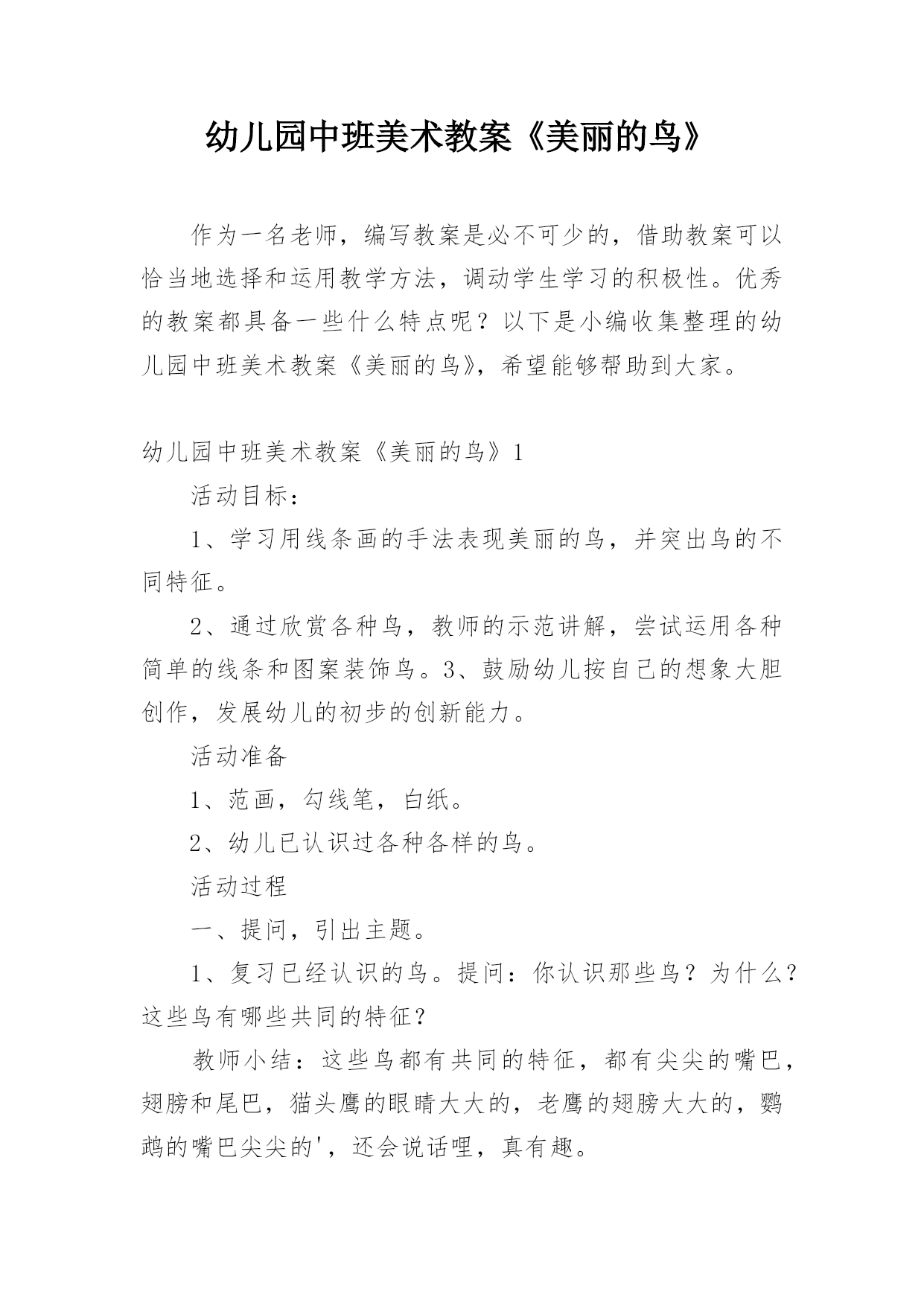 幼儿园中班美术教案《美丽的鸟》作为一名老师,编写教案是必不可少的,借助教案可以恰当地选择和运用教学方法,调动学生学习的积极性。优秀的教案都具备一些什么特点呢?以下是小编收集整理的幼儿园中班美术教案《美丽的鸟》,希望能够帮助到大家。幼儿园中班美术教案《美丽的鸟》1活动目标:1、学习用线条画的手法表现美丽的鸟,并突出鸟的不同特征。2、通过欣赏各种鸟,教师的示范讲解,尝试运用各种简单的线条和图案装饰鸟。3、鼓励幼儿按自己的想象大胆创作,发展幼儿的初步的创新能力。活动准备1、范画,勾线笔,白纸。2、幼儿已认识过各