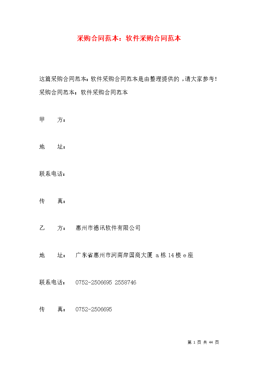 采购合同范本:软件采购合同范本这篇采购合同范本:软件采购合同范本是由整理提供的请大家参考!采购合同范本:软件采购合同范本甲方:地址:联系电话:传真:乙方:惠州市德讯软件有限公司地址:广东省惠州市河南岸国商大厦a栋14楼e座联系电话:0752-25066952558746传真:0752-2506695甲乙双方经友好协商甲方向乙方购买“