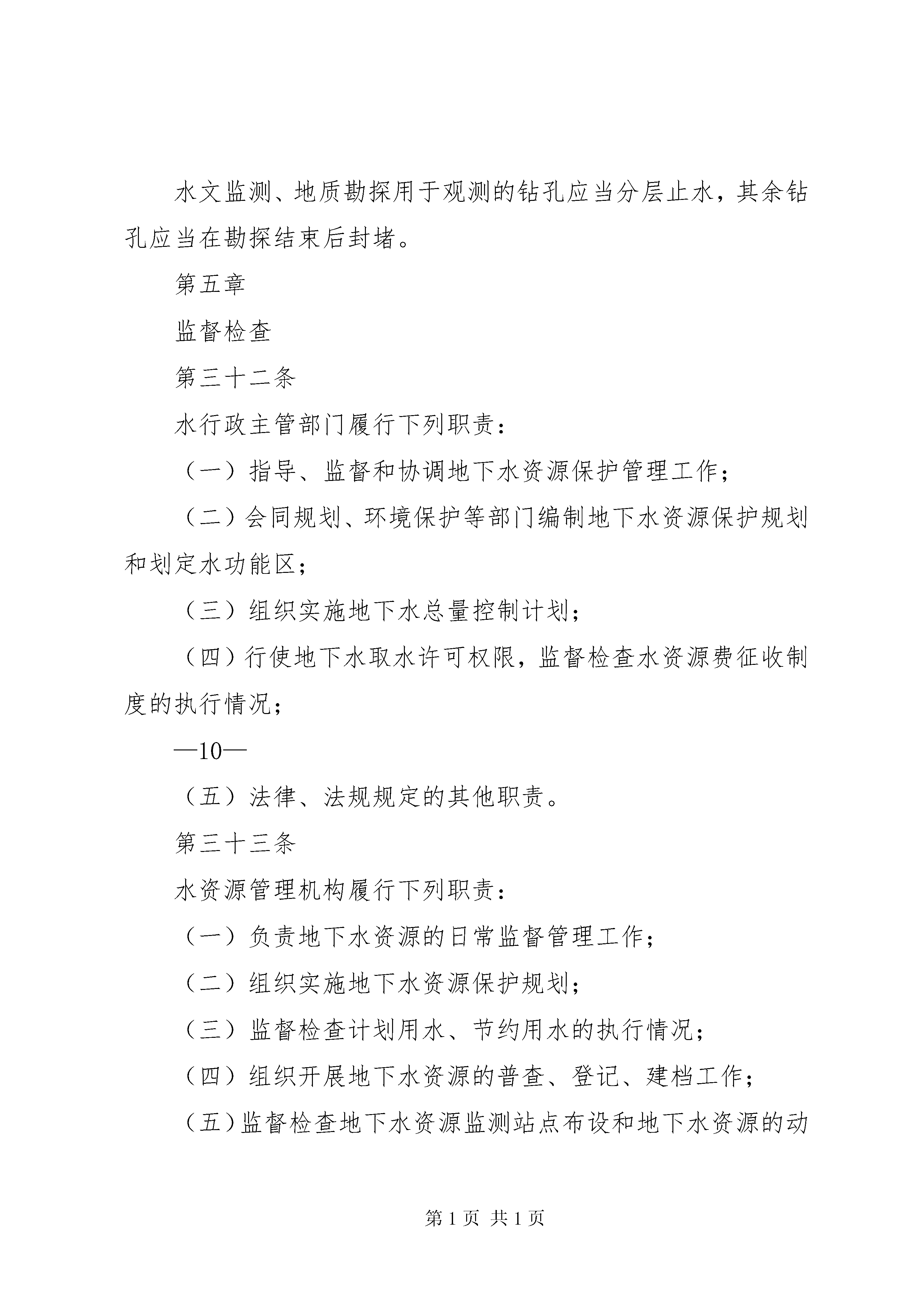 第PAGE\*Arabic\*MERGEFORMAT13页共NUMPAGES\*MERGEFORMAT13页关于加强城市地下水资源保护的调研报告XX市地下水资源保护管理办法第295号(2013年6月16日发布,2017年10月30日修订)第一章总则第一条为了规范地下水资源的保护和管理,合理开发利用地下水资源,促进地下水资源的可持续利用,根据《中华人民共和国水法》、国务院《取水许可和水资源费征收管理条例》、《XX市水资源保护条例》等法律、法规,结合本市实际,制定本办法。第二条本市行政区域内地下水