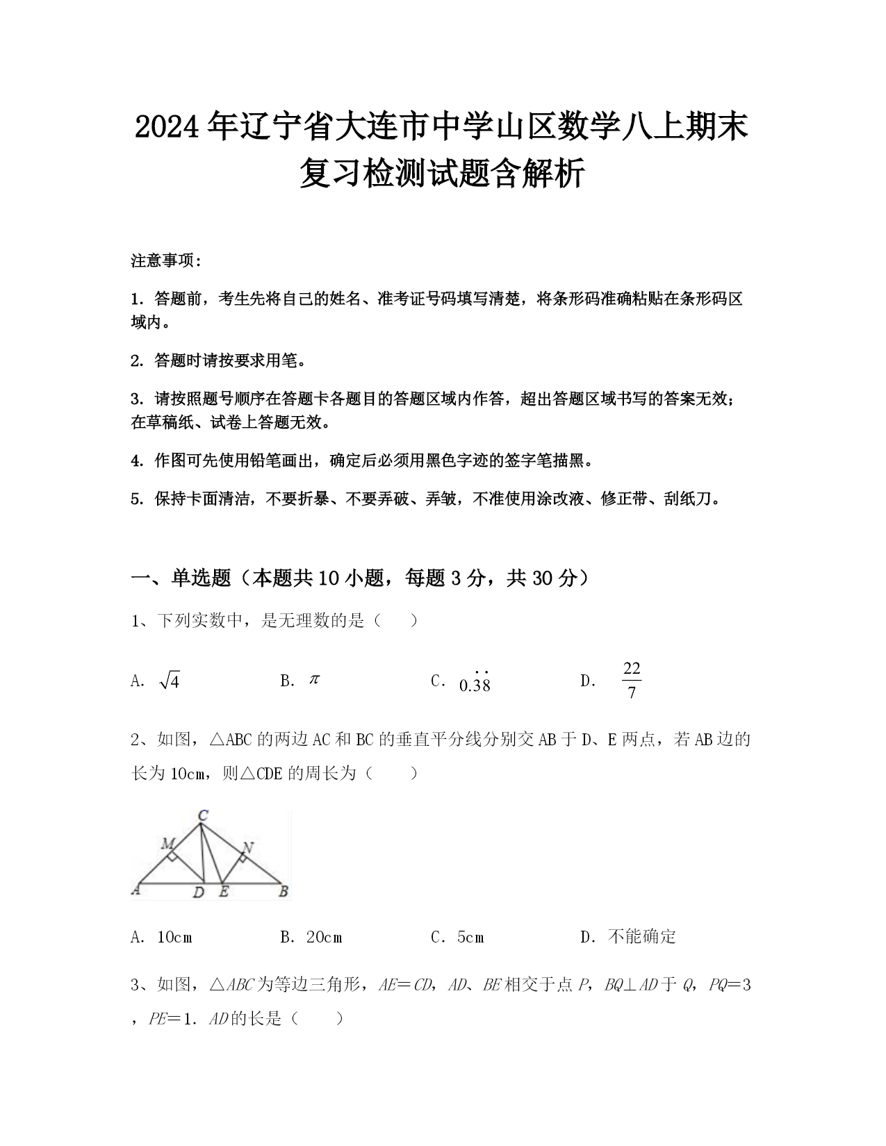 2024年辽宁省大连市中学山区数学八上期末复习检测试题含解析注意事项:1.答题前,考生先将自己的姓名、准考证号码填写清楚,将条形码准确粘贴在条形码区域内。2.答题时请按要求用笔。3.请按照题号顺序在答题卡各题目的答题区域内作答,超出答题区域书写的答案无效;在草稿纸、试卷上答题无效。4.作图可先使用铅笔画出,确定后必须用黑色字迹的签字笔描黑。5.保持卡面清洁,不要折暴、不要弄破、弄皱,不准使用涂改液、修正带、刮纸刀。一、单选题(本题共10小题,每题3分,共30分)1、下列实数中,是无理数的是()A.B.C.