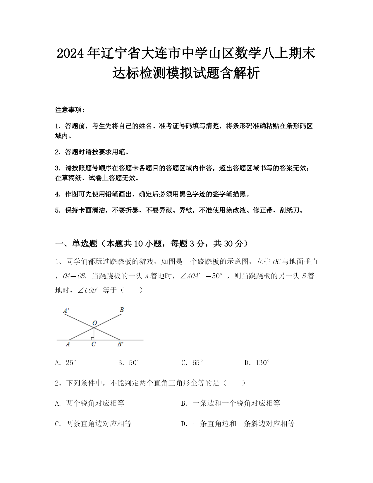 2024年辽宁省大连市中学山区数学八上期末达标检测模拟试题含解析注意事项:1.答题前,考生先将自己的姓名、准考证号码填写清楚,将条形码准确粘贴在条形码区域内。2.答题时请按要求用笔。3.请按照题号顺序在答题卡各题目的答题区域内作答,超出答题区域书写的答案无效;在草稿纸、试卷上答题无效。4.作图可先使用铅笔画出,确定后必须用黑色字迹的签字笔描黑。5.保持卡面清洁,不要折暴、不要弄破、弄皱,不准使用涂改液、修正带、刮纸刀。一、单选题(本题共10小题,每题3分,共30分)1、同学们都玩过跷跷板的游戏,如图是一个