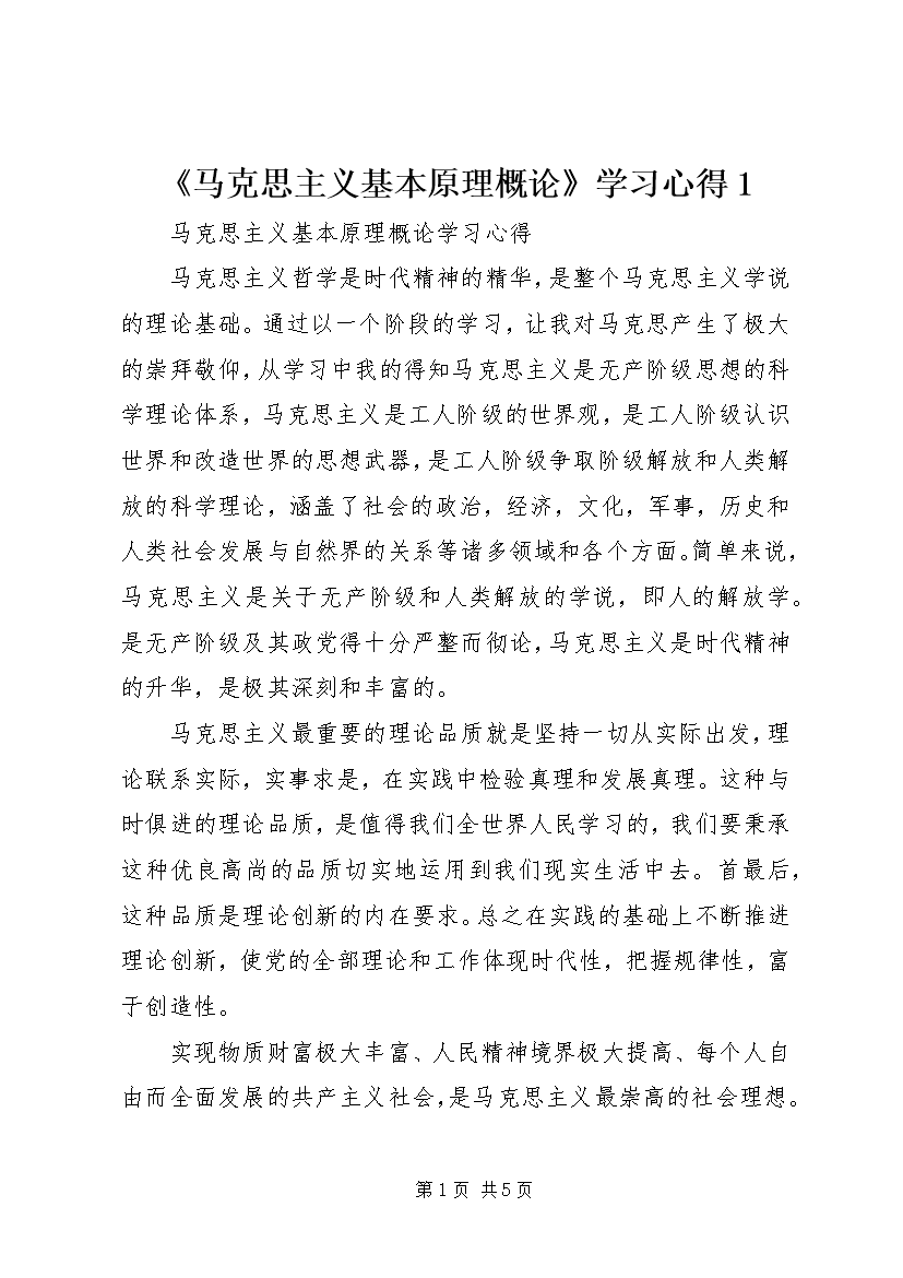 第PAGE\*Arabic\*MERGEFORMAT5页共NUMPAGES\*MERGEFORMAT5页《马克思主义基本原理概论》学习心得马克思主义基本原理概论学习心得马克思主义哲学是时代精神的精华,是整个马克思主义学说的理论基础。通过以一个阶段的学习,让我对马克思产生了极大的崇拜敬仰,从学习中我的得知马克思主义是无产阶级思想的科学理论体系,马克思主义是工人阶级的世界观,是工人阶级认识世界和改造世界的思想武器,是工人阶级争取阶级解放和人类解放的科学理论,涵盖了社会的政治,经济,文化,军事,历史