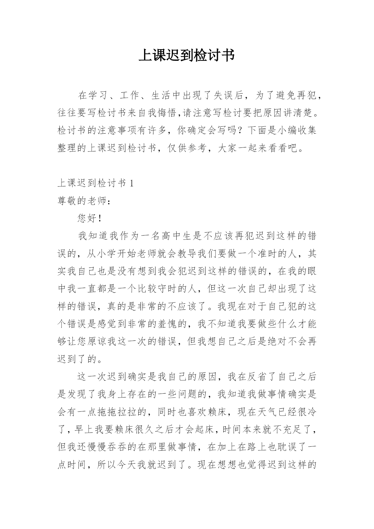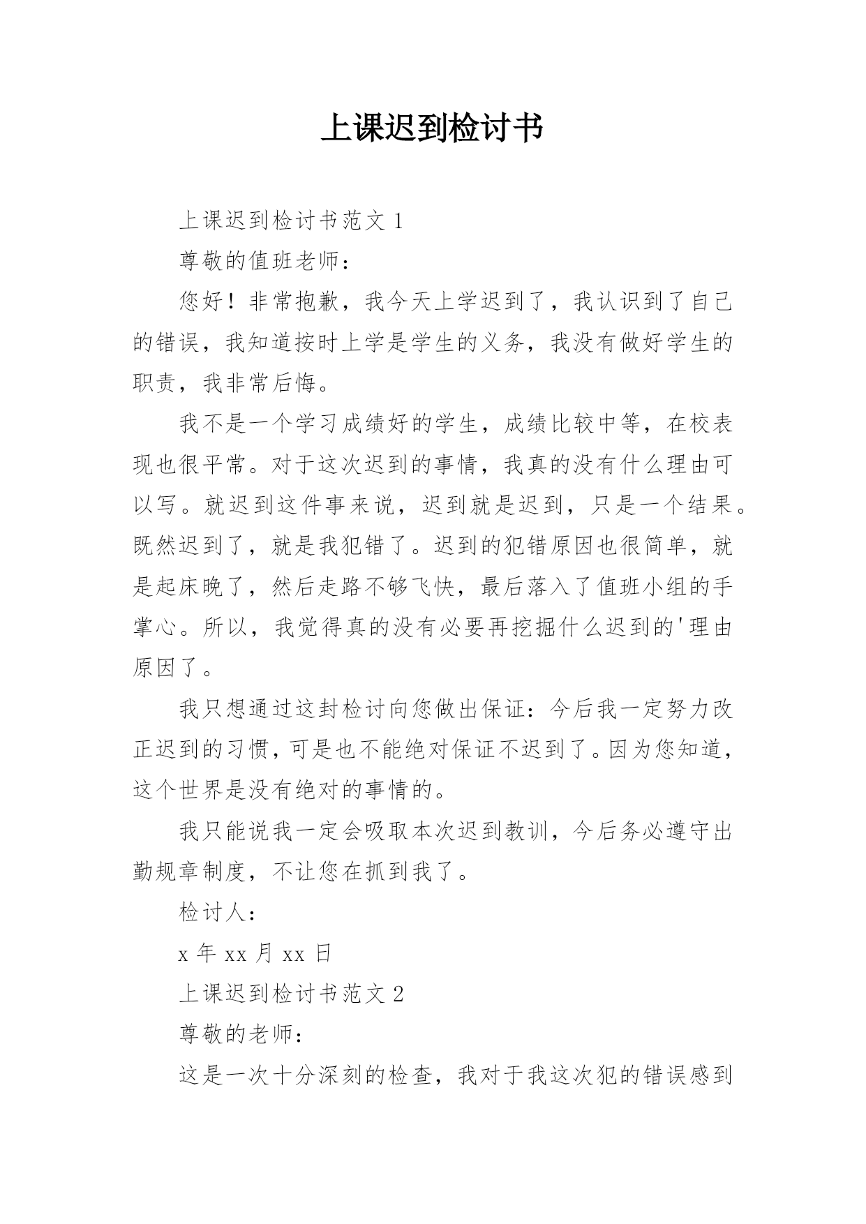 上课迟到检讨书上课迟到检讨书在学习、工作或生活中出现了过错后,为了表明自己悔改的决心,往往被要求写检讨书来自我检讨,在写检讨书的时候要注意用语诚恳。你所见过的检讨书是什么样的呢?下面是小编帮大家整理的上课迟到检讨书,仅供参考,大家一起来看看吧。上课迟到检讨书1尊敬的XXX老师:今日我怀着愧疚和后悔给您写下这份检讨书,以向您表示我对迟到这种不良行为的深刻相识以及再也不迟到的决心。于是我一再告知自己要把此事当成头等大事来抓,不能辜负老师对我们的一片苦心。早在我踏进校门,老师就已三申五令,一再强调,全班同学不得