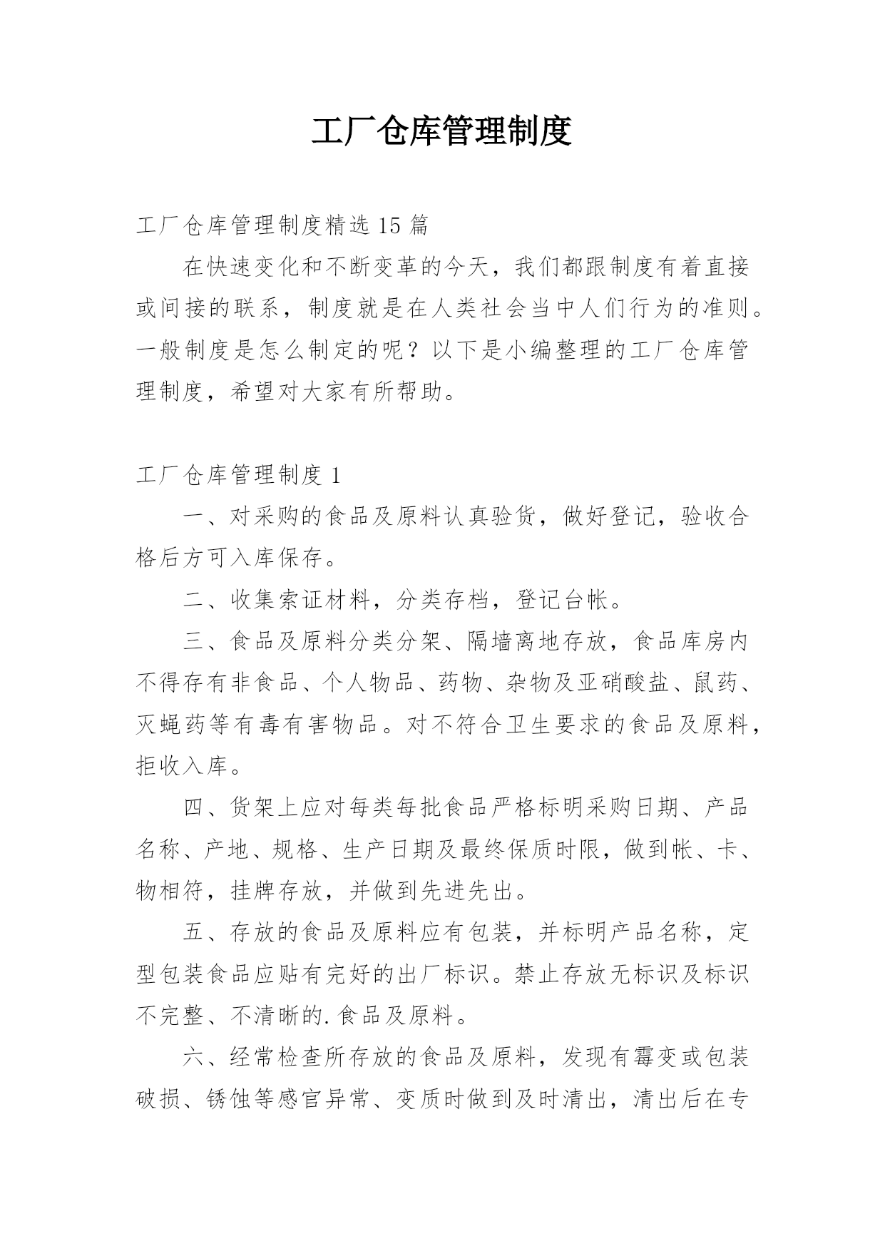 工厂仓库管理制度工厂仓库管理制度精选15篇在快速变化和不断变革的今天,我们都跟制度有着直接或间接的联系,制度就是在人类社会当中人们行为的准则。一般制度是怎么制定的呢?以下是小编整理的工厂仓库管理制度,希望对大家有所帮助。工厂仓库管理制度1一、对采购的食品及原料认真验货,做好登记,验收合格后方可入库保存。二、收集索证材料,分类存档,登记台帐。三、食品及原料分类分架、隔墙离地存放,食品库房内不得存有非食品、个人物品、药物、杂物及亚硝酸盐、鼠药、灭蝇药等有毒有害物品。对不符合卫生要求的食品及原料,拒收入库。四、
