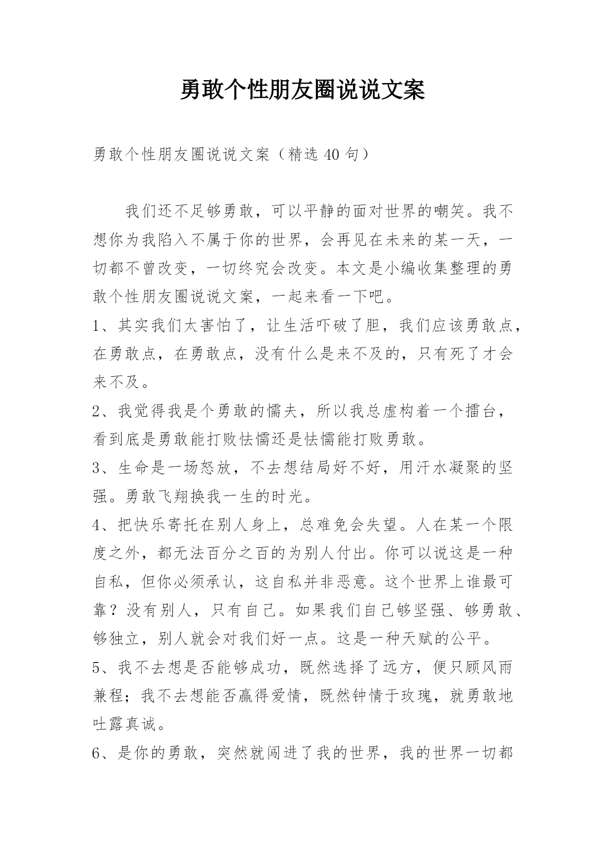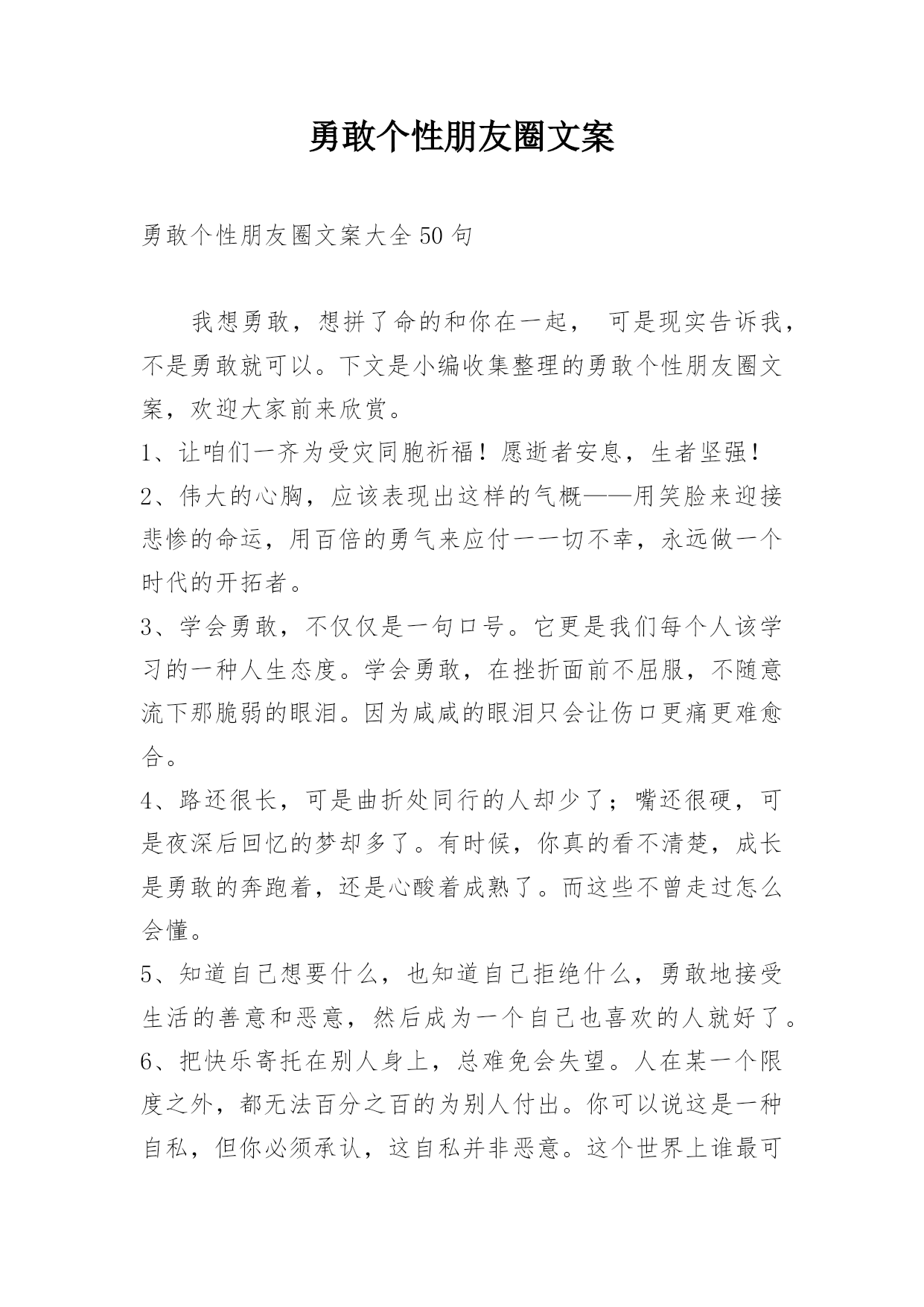 勇敢个性朋友圈说说文案勇敢个性朋友圈说说文案50句精选鹿沐梓明天也要作伴也要勇敢。下文是小编为大家推荐的勇敢个性朋友圈说说文案,欢迎大家分享。1、人有了勇敢的气质,生活起来就会觉得充实,做起事来就会事半功倍。2、学会勇敢,不仅仅是一句口号。它更是我们每个人该学习的一种人生态度。学会勇敢,在挫折面前不屈服,不随意流下那脆弱的眼泪。因为咸咸的眼泪只会让伤口更痛更难愈合。3、一个成熟的男人最可爱的时候有二:一是他汗流浃背,挥汗如雨的时候;一是他勇敢的时候,下一刻刀山火海,依旧从容豪迈地走下去。4、人有一点年纪总