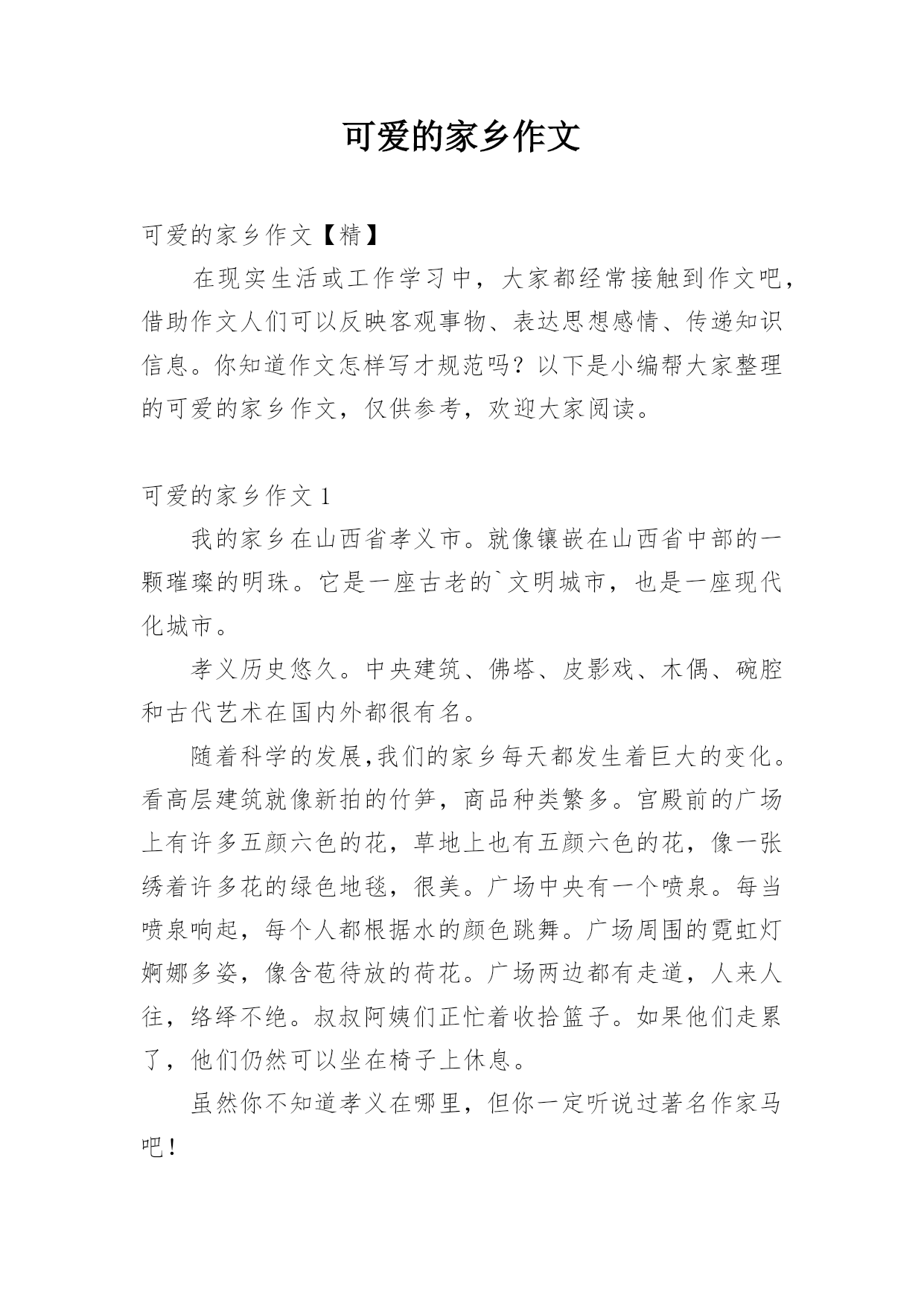 可爱的家乡作文可爱的家乡作文【精】在现实生活或工作学习中,大家都经常接触到作文吧,借助作文人们可以反映客观事物、表达思想感情、传递知识信息。你知道作文怎样写才规范吗?以下是小编帮大家整理的可爱的家乡作文,仅供参考,欢迎大家阅读。可爱的家乡作文1我的家乡在山西省孝义市。就像镶嵌在山西省中部的一颗璀璨的明珠。它是一座古老的`文明城市,也是一座现代化城市。孝义历史悠久。中央建筑、佛塔、皮影戏、木偶、碗腔和古代艺术在国内外都很有名。随着科学的发展,我们的家乡每天都发生着巨大的变化。看高层建筑就像新拍的竹笋,商品种