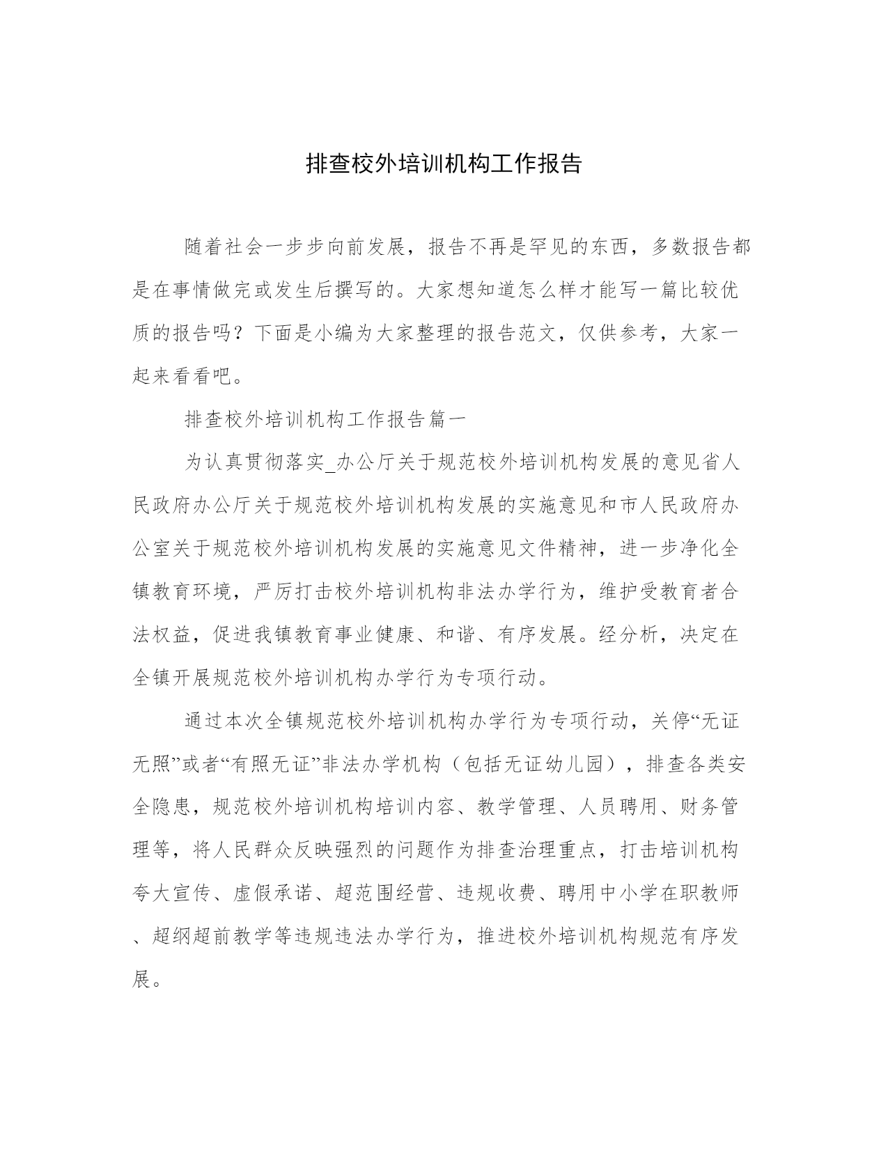 排查校外培训机构工作报告随着社会一步步向前发展,报告不再是罕见的东西,多数报告都是在事情做完或发生后撰写的。大家想知道怎么样才能写一篇比较优质的报告吗?下面是小编为大家整理的报告范文,仅供参考,大家一起来看看吧。排查校外培训机构工作报告篇一为认真贯彻落实_办公厅关于规范校外培训机构发展的意见省人民政府办公厅关于规范校外培训机构发展的实施意见和市人民政府办公室关于规范校外培训机构发展的实施意见文件精神,进一步净化全镇教育环境,严厉打击校外培训机构非法办学行为,维护受教育者合法权益,促进我镇教育事业健康、和谐
