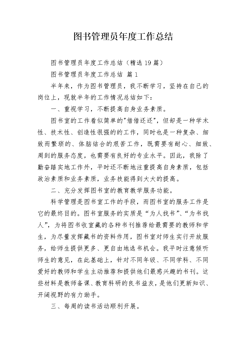 图书管理员年度工作总结图书管理员年度工作总结(精选19篇)图书管理员年度工作总结篇1半年来,作为图书管理员,我不断学习,坚持在自己的岗位上,现就半年的工作情况总结如下:一、重视学习,不断提高自身业务素质。图书室的工作看似简单的"借借还还",但却是一种学术性、技术性、创造性很强的的工作,同时也是一种复杂、细致而繁琐的、体脑结合的艰苦工作,既需要有耐心、细致、周到的服务态度,也需要有良好的专业水平。因此,我除了勤奋踏实地工作外,平时还不断地注重提高自身素质,包括政治素质和业务素质,业务技能得到大大的提高。二、
