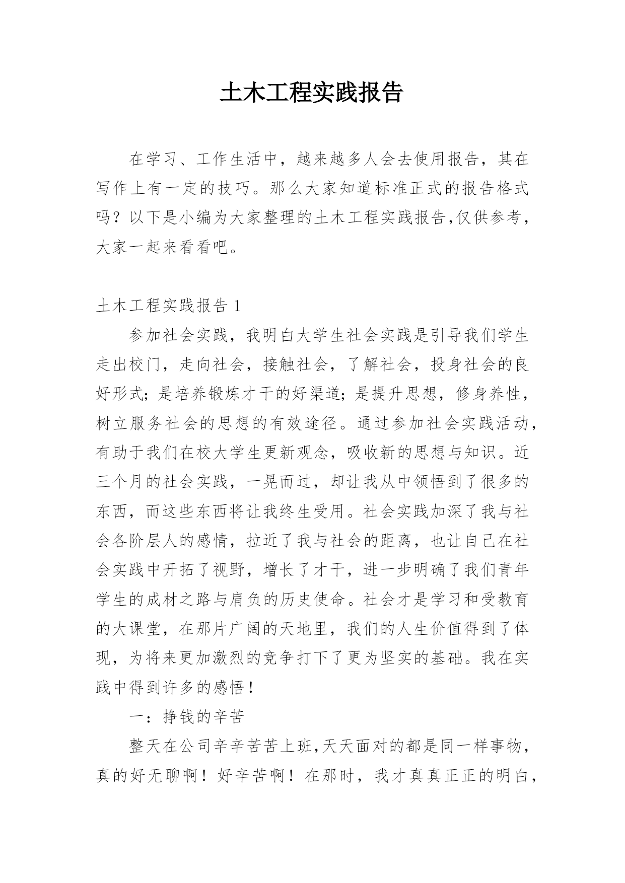 土木工程实践报告在学习、工作生活中,越来越多人会去使用报告,其在写作上有一定的技巧。那么大家知道标准正式的报告格式吗?以下是小编为大家整理的土木工程实践报告,仅供参考,大家一起来看看吧。土木工程实践报告1参加社会实践,我明白大学生社会实践是引导我们学生走出校门,走向社会,接触社会,了解社会,投身社会的良好形式;是培养锻炼才干的好渠道;是提升思想,修身养性,树立服务社会的思想的有效途径。通过参加社会实践活动,有助于我们在校大学生更新观念,吸收新的思想与知识。近三个月的社会实践,一晃而过,却让我从中领悟到了很