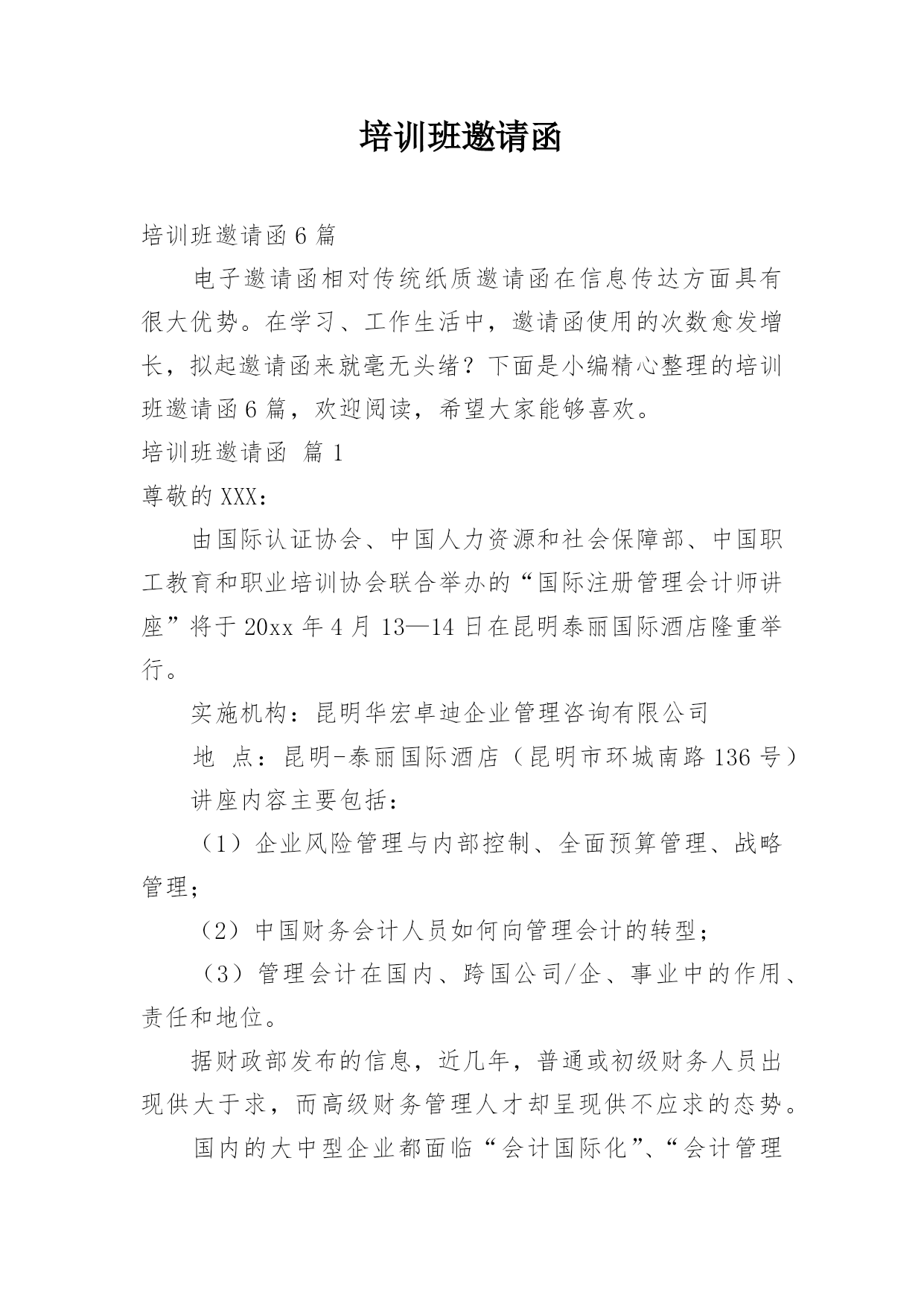 培训班邀请函培训班邀请函邀请函是商务礼仪与世俗礼仪的其中一部分。在日新月异的现代社会中,很多场合都离不了邀请函,大家知道邀请函的格式吗?下面是小编为大家整理的培训班邀请函,希望能够帮助到大家。培训班邀请函1尊敬的xxx:由国际认证协会、中国人力资源和社会保障部、中国职工教育和职业培训协会联合举办的“国际注册管理会计师讲座”将于20xx年4月13—14日在昆明泰丽国际酒店隆重举行。实施机构:昆明xxxx企业管理咨询有限公司地点:昆明-泰丽国际酒店(昆明市xxx路136号)讲座内容主要包括:(1)企业风险管理