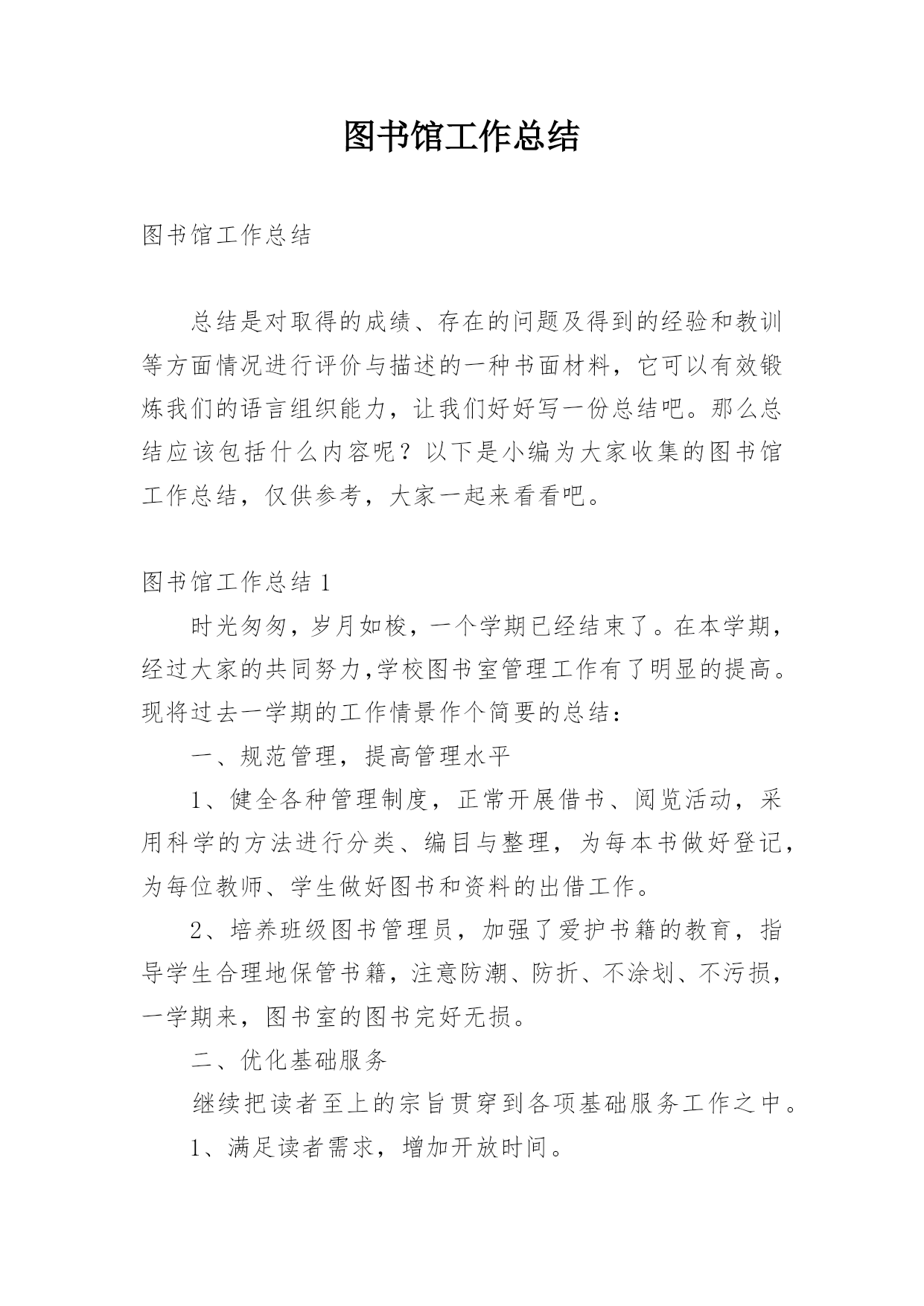 图书馆工作总结图书馆工作总结总结是对取得的成绩、存在的问题及得到的经验和教训等方面情况进行评价与描述的一种书面材料,它可以有效锻炼我们的语言组织能力,让我们好好写一份总结吧。那么总结应该包括什么内容呢?以下是小编为大家收集的图书馆工作总结,仅供参考,大家一起来看看吧。图书馆工作总结1时光匆匆,岁月如梭,一个学期已经结束了。在本学期,经过大家的共同努力,学校图书室管理工作有了明显的提高。现将过去一学期的工作情景作个简要的总结:一、规范管理,提高管理水平1、健全各种管理制度,正常开展借书、阅览活动,采用科学的