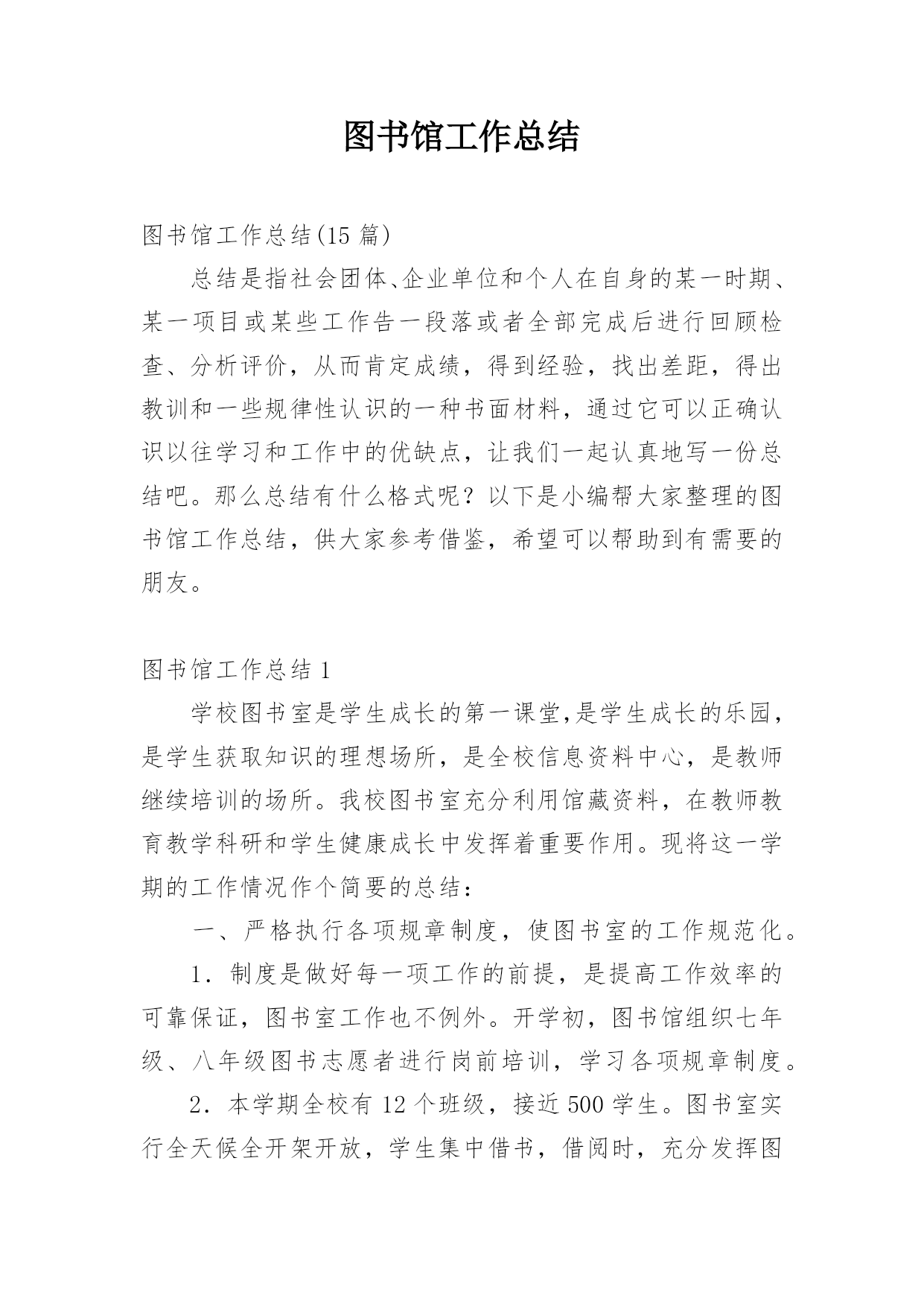 图书馆工作总结图书馆工作总结(15篇)总结是指社会团体、企业单位和个人在自身的某一时期、某一项目或某些工作告一段落或者全部完成后进行回顾检查、分析评价,从而肯定成绩,得到经验,找出差距,得出教训和一些规律性认识的一种书面材料,通过它可以正确认识以往学习和工作中的优缺点,让我们一起认真地写一份总结吧。那么总结有什么格式呢?以下是小编帮大家整理的图书馆工作总结,供大家参考借鉴,希望可以帮助到有需要的朋友。图书馆工作总结1学校图书室是学生成长的第一课堂,是学生成长的乐园,是学生获取知识的理想场所,是全校信息资料