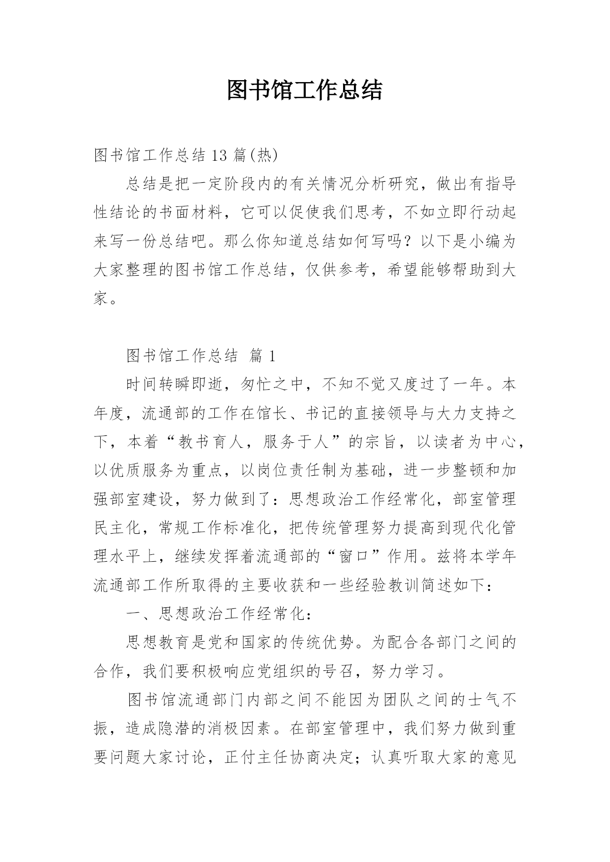 图书馆工作总结图书馆工作总结13篇(热)总结是把一定阶段内的有关情况分析研究,做出有指导性结论的书面材料,它可以促使我们思考,不如立即行动起来写一份总结吧。那么你知道总结如何写吗?以下是小编为大家整理的图书馆工作总结,仅供参考,希望能够帮助到大家。图书馆工作总结篇1时间转瞬即逝,匆忙之中,不知不觉又度过了一年。本年度,流通部的工作在馆长、书记的直接领导与大力支持之下,本着“教书育人,服务于人”的宗旨,以读者为中心,以优质服务为重点,以岗位责任制为基础,进一步整顿和加强部室建设,努力做到了:思想政治工作经常