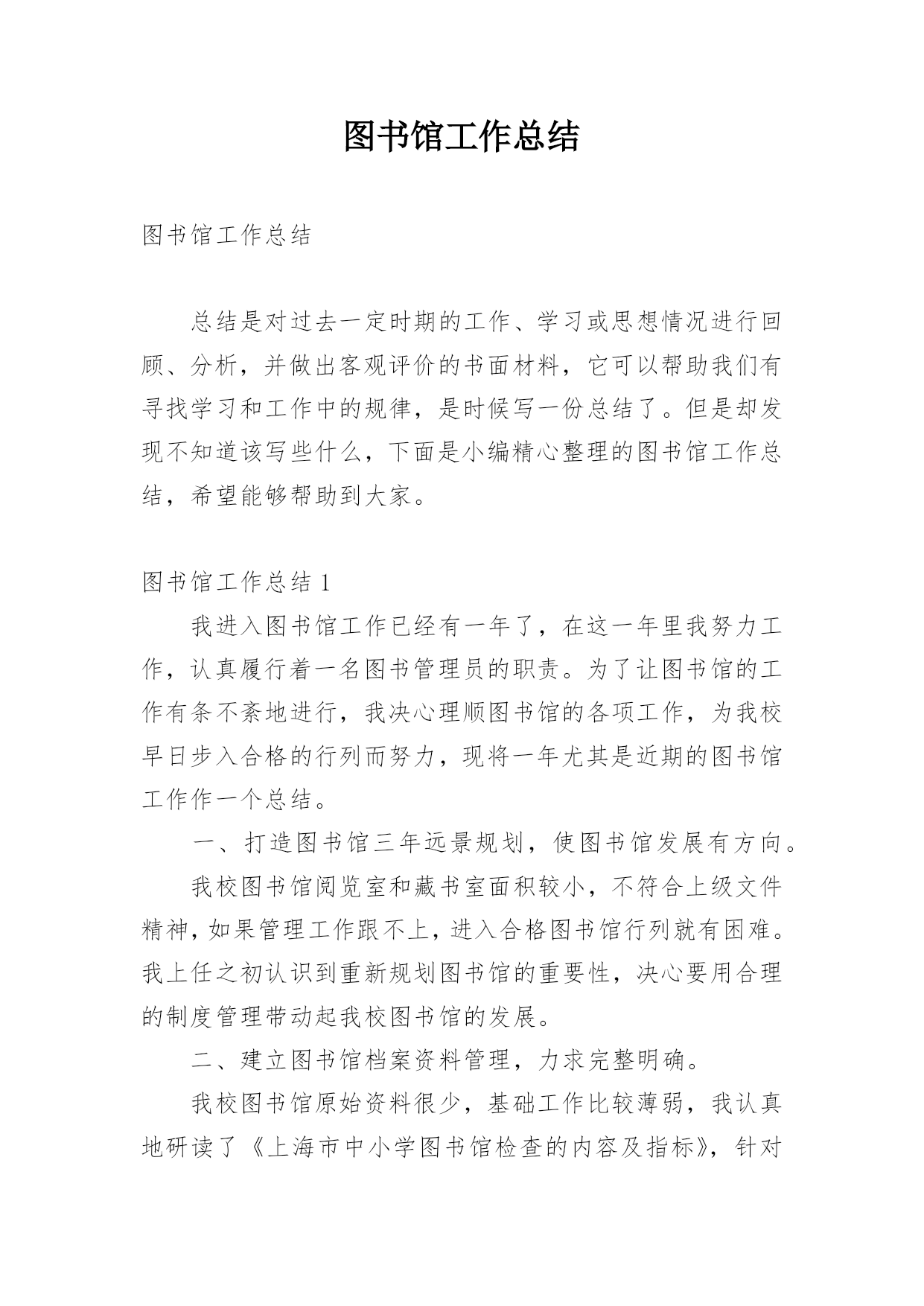图书馆工作总结图书馆工作总结总结是对过去一定时期的工作、学习或思想情况进行回顾、分析,并做出客观评价的书面材料,它可以帮助我们有寻找学习和工作中的规律,是时候写一份总结了。但是却发现不知道该写些什么,下面是小编精心整理的图书馆工作总结,希望能够帮助到大家。图书馆工作总结1我进入图书馆工作已经有一年了,在这一年里我努力工作,认真履行着一名图书管理员的职责。为了让图书馆的工作有条不紊地进行,我决心理顺图书馆的各项工作,为我校早日步入合格的行列而努力,现将一年尤其是近期的图书馆工作作一个总结。一、打造图书馆三年